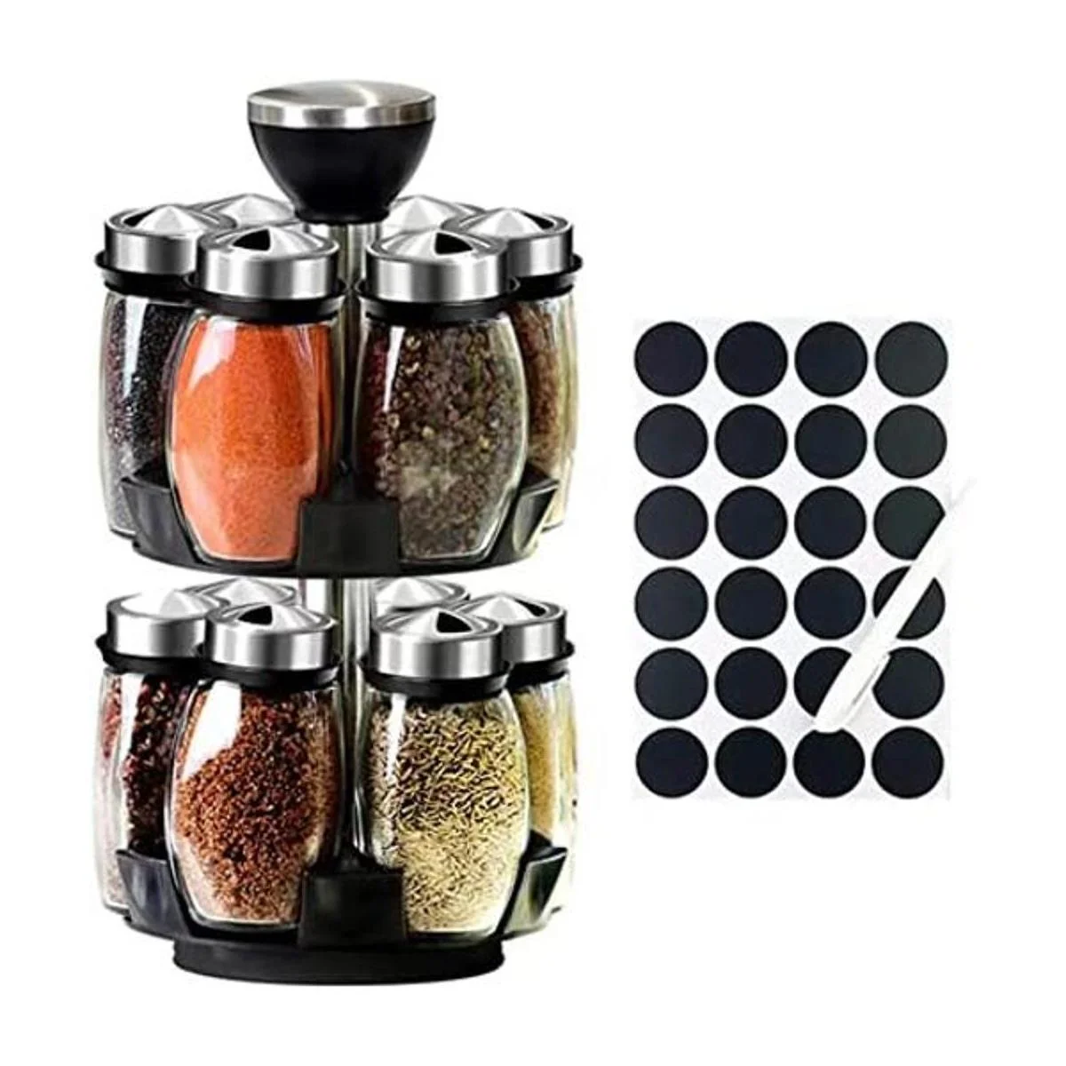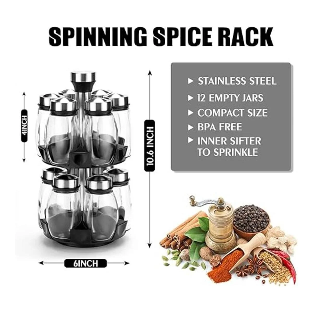 Incluye 12 tarros de especias: el organizador de especias incluye 12 tarros no incluye especias y cuenta con tapas para verter para medir y condimentar fácilmente.