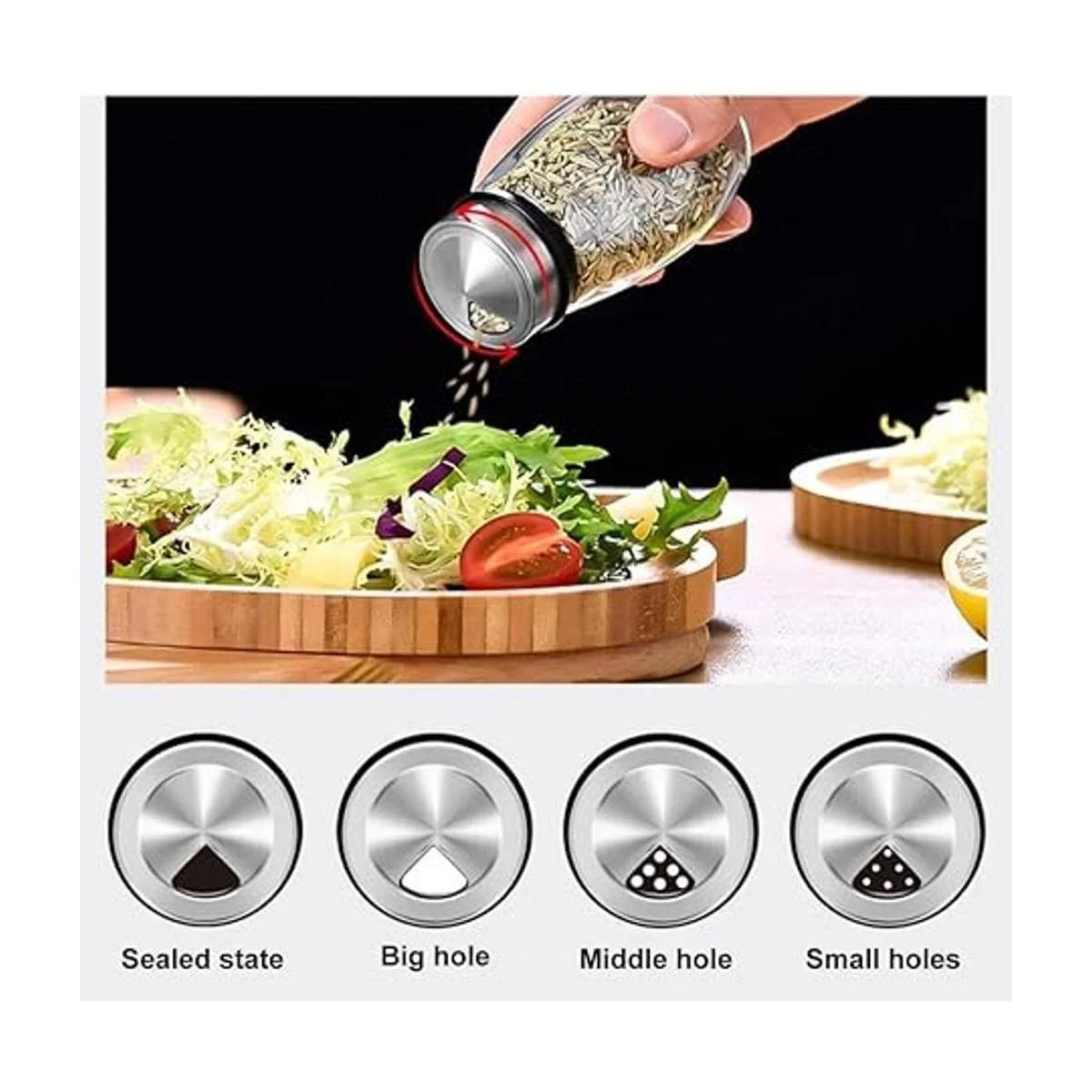Tamaño de salida ajustable: la tapa tiene tres tipos de puertos de descarga y se puede girar de acuerdo con el tamaño de partícula, y la rotación de 360 se puede cambiar a voluntad. Boca grande de 1.3 in, fácil y conveniente al llenar el condimento, no se derrama fácilmente, a prueba de polvo y humedad, buena hermeticidad, seguridad y saneamiento.