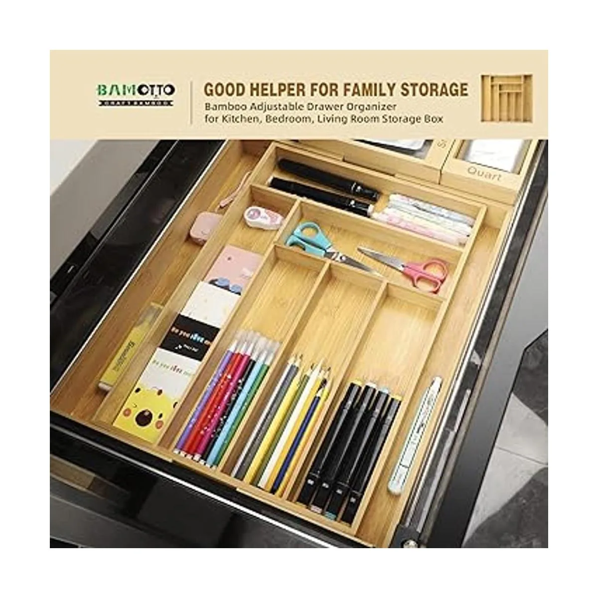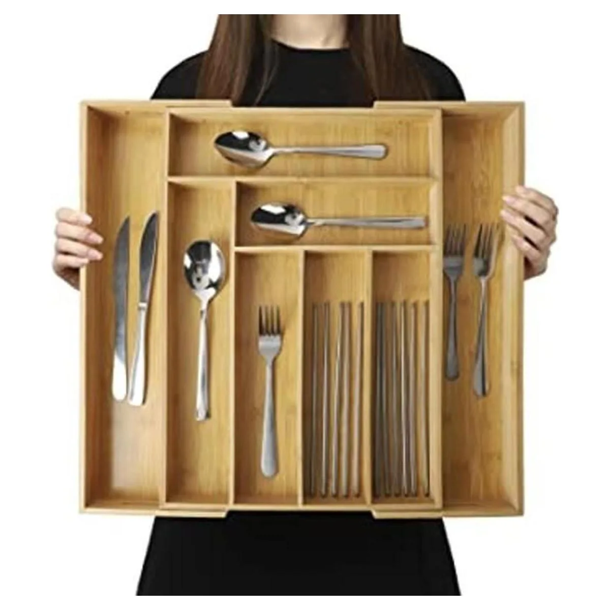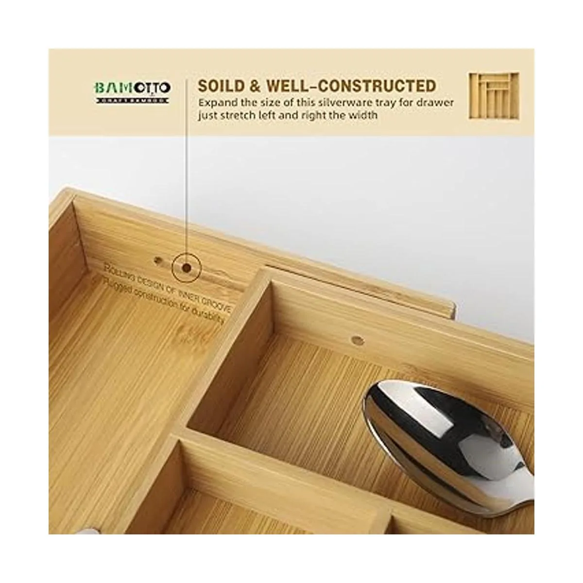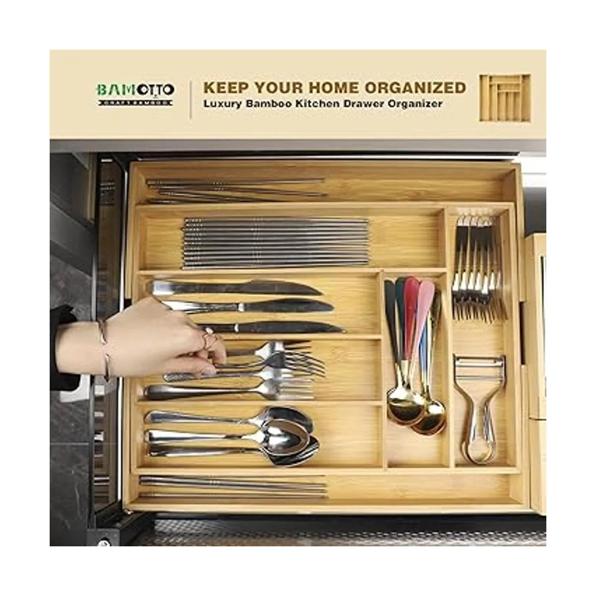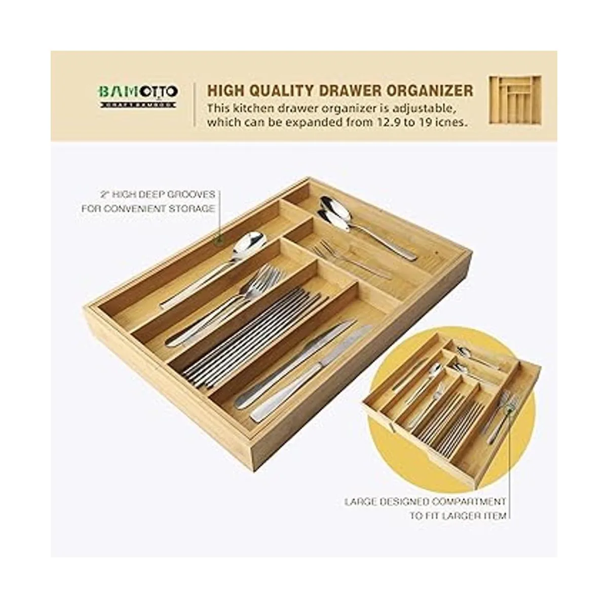 Organizador de utensilios expandible y ajustable: este organizador de cubiertos de bambú está diseñado con 68 compartimentos se puede ajustar de 12.9 pulgadas cerrado a 19 pulgadas extendido, con deslizamiento suave.