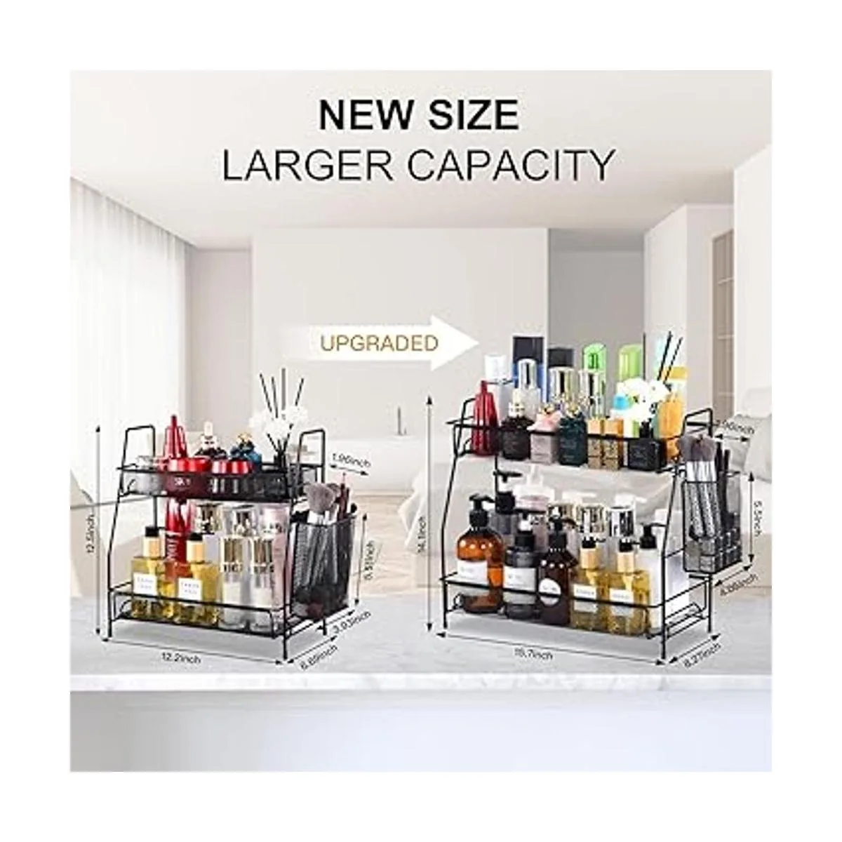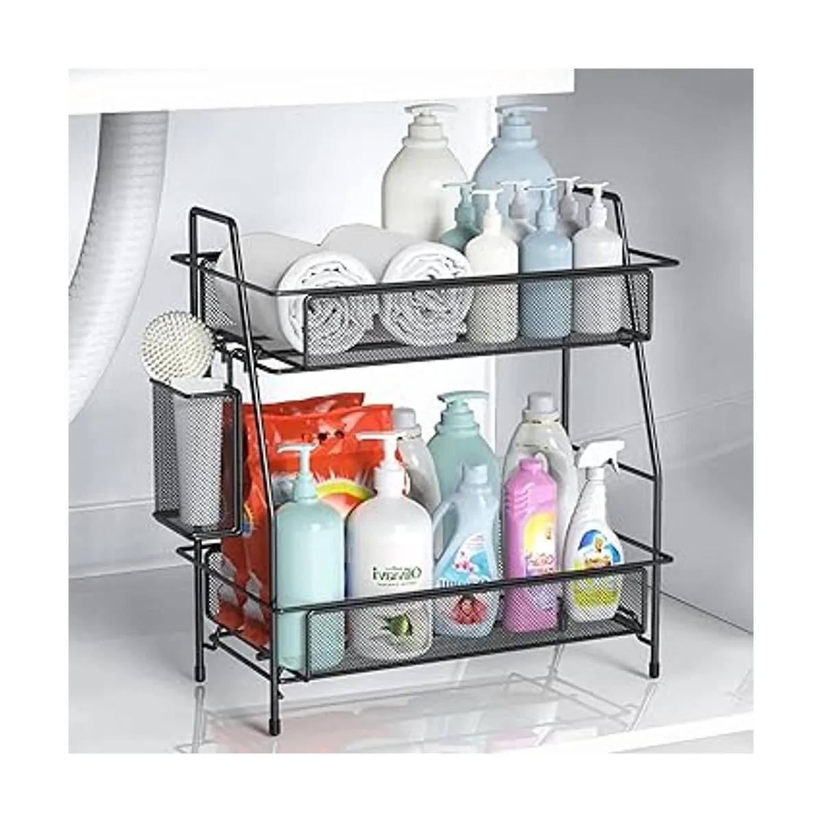 Diseño de barandilla alta y rejilla: el organizador de baño grande, organizador de cocina, almacenamiento debajo del fregadero tiene barandillas adicionales para evitar que los artículos se caigan, y la base diseñada por rejilla también puede evitar que los artículos se vuelquen.