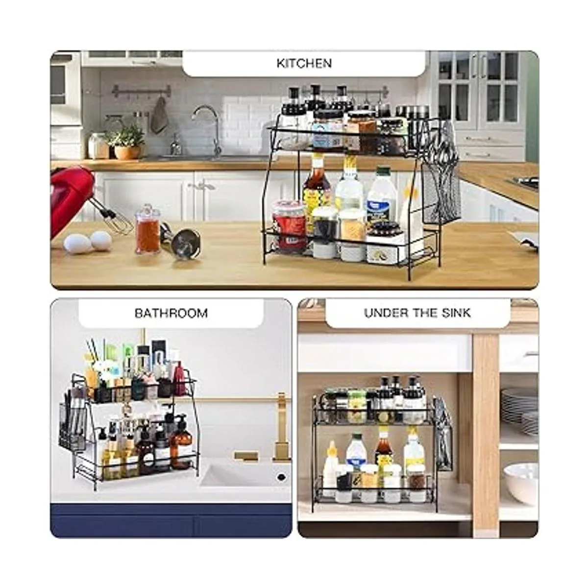 Diseño que ahorra espacio: organizador debajo del fregadero de dos capas 8 x 14 x 16 pulgadas son ideales para almacenar especias, lociones, maquillaje, champú, esmaltes de uñas y otros cosméticos. til en cualquier habitación de casa, incluyendo la cocina, baño, sala de manualidades, encimera de baño, oficina, etc.
