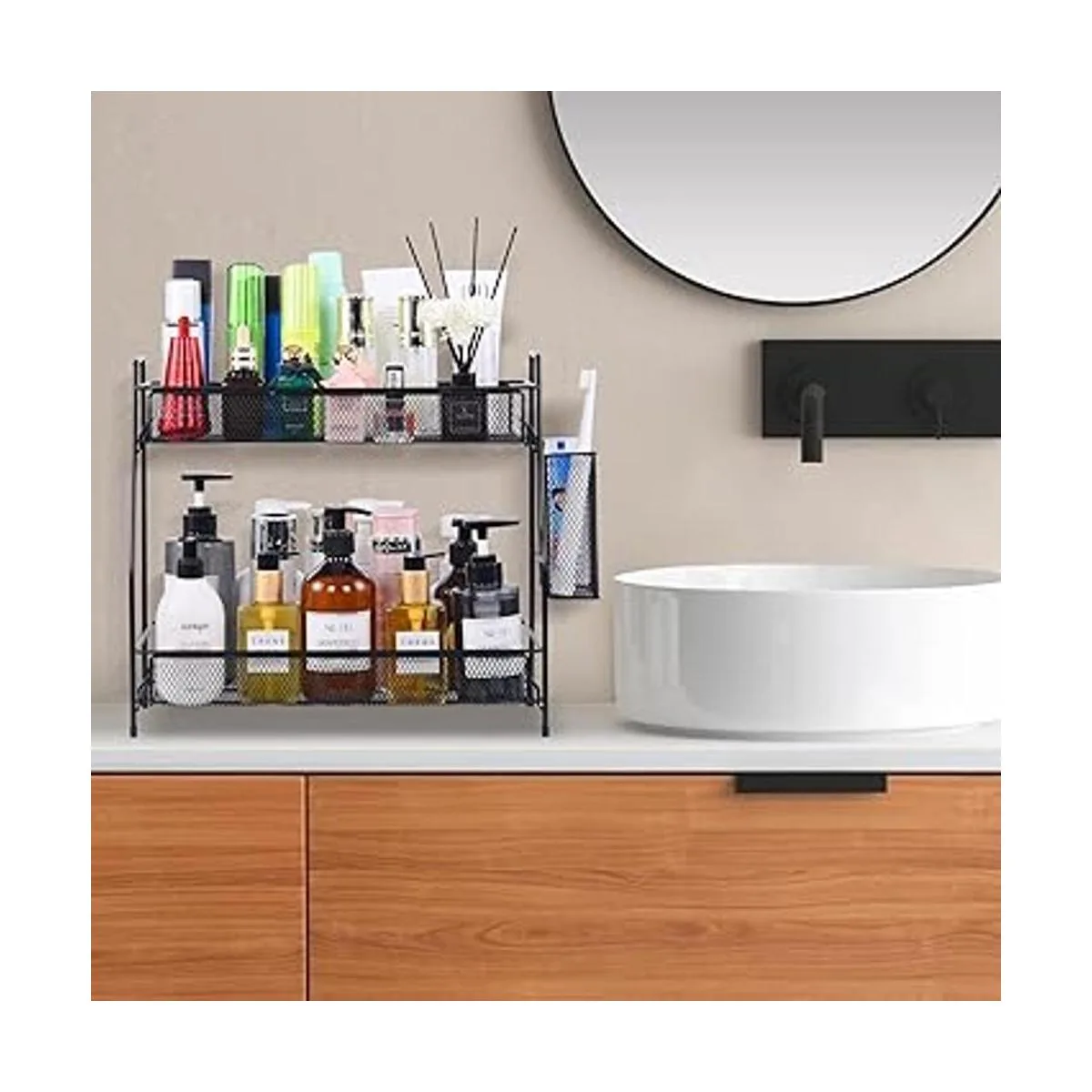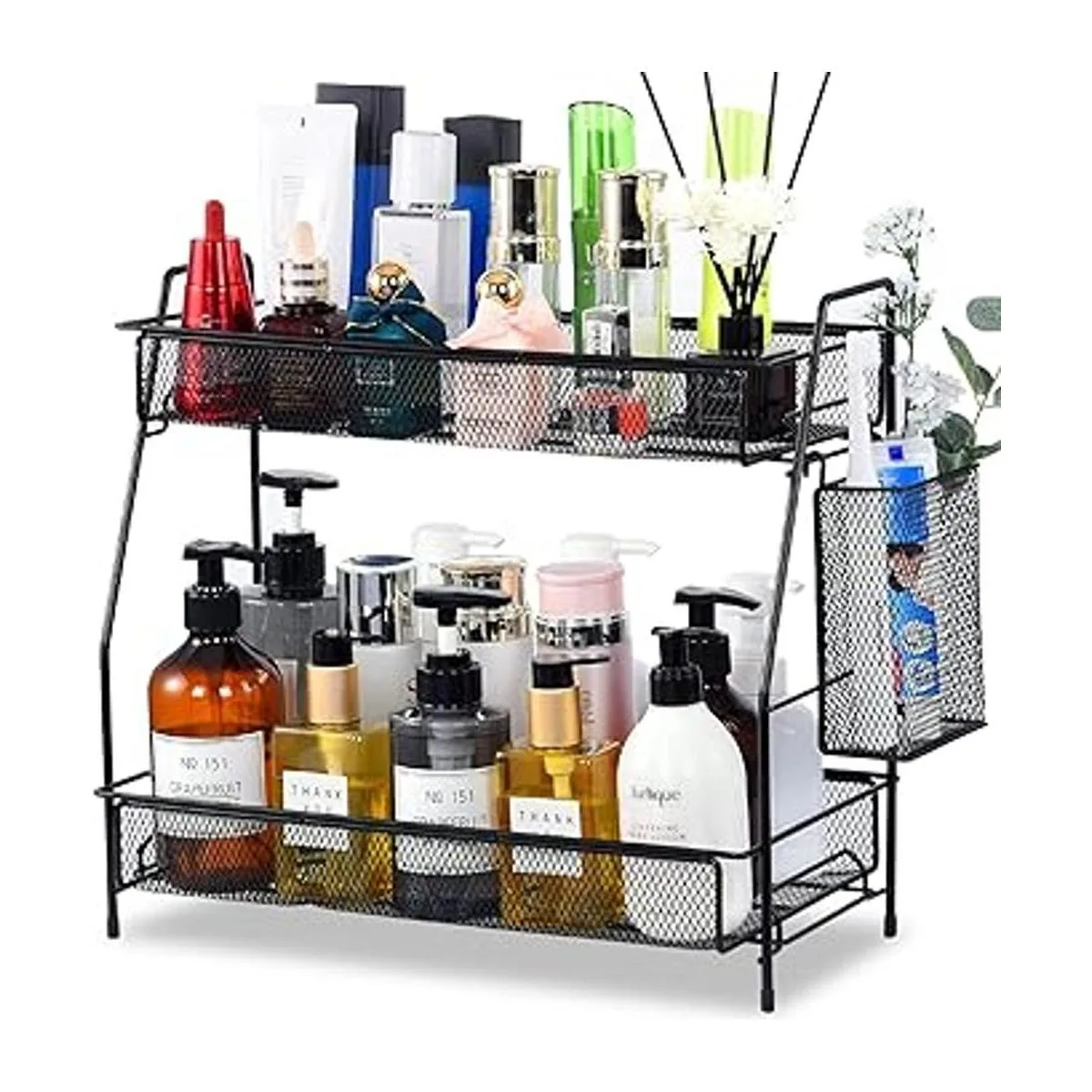 Organizador grande de encimera para encimera de baño, organizador para dormitorio, organizador para debajo del fregadero, organizador de especias para cocina con cesta negro