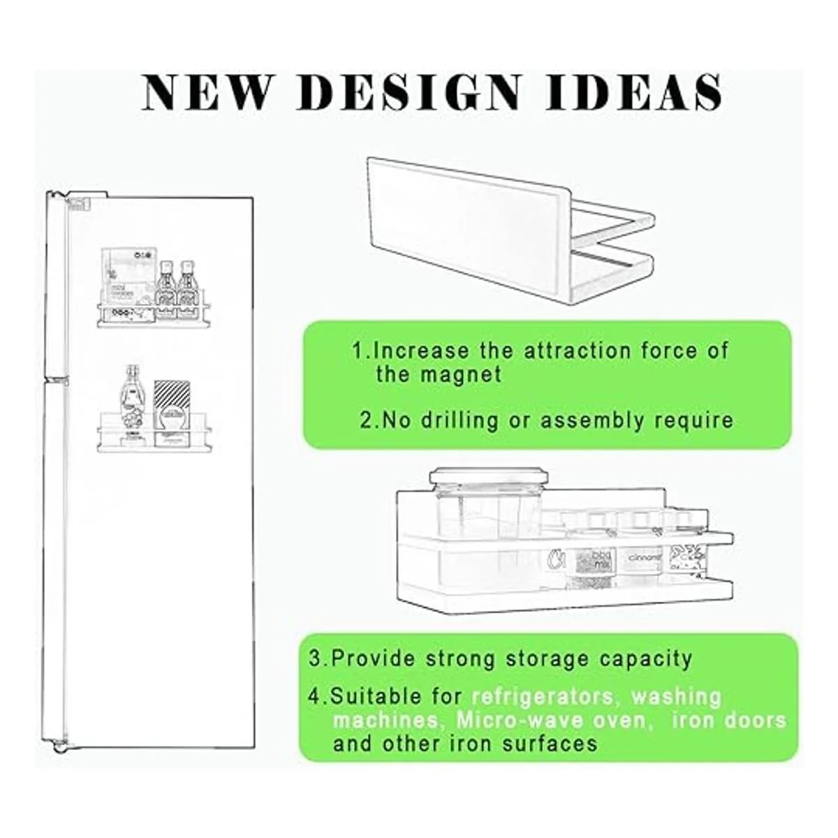 Fácil de usar; no requiere taladrar ni montar. El imán es notablemente fuerte, puede soportar 5 libras. Fácil de fijar al lado del refrigerador u otras superficies de hierro. No se desliza gradualmente por la nevera.