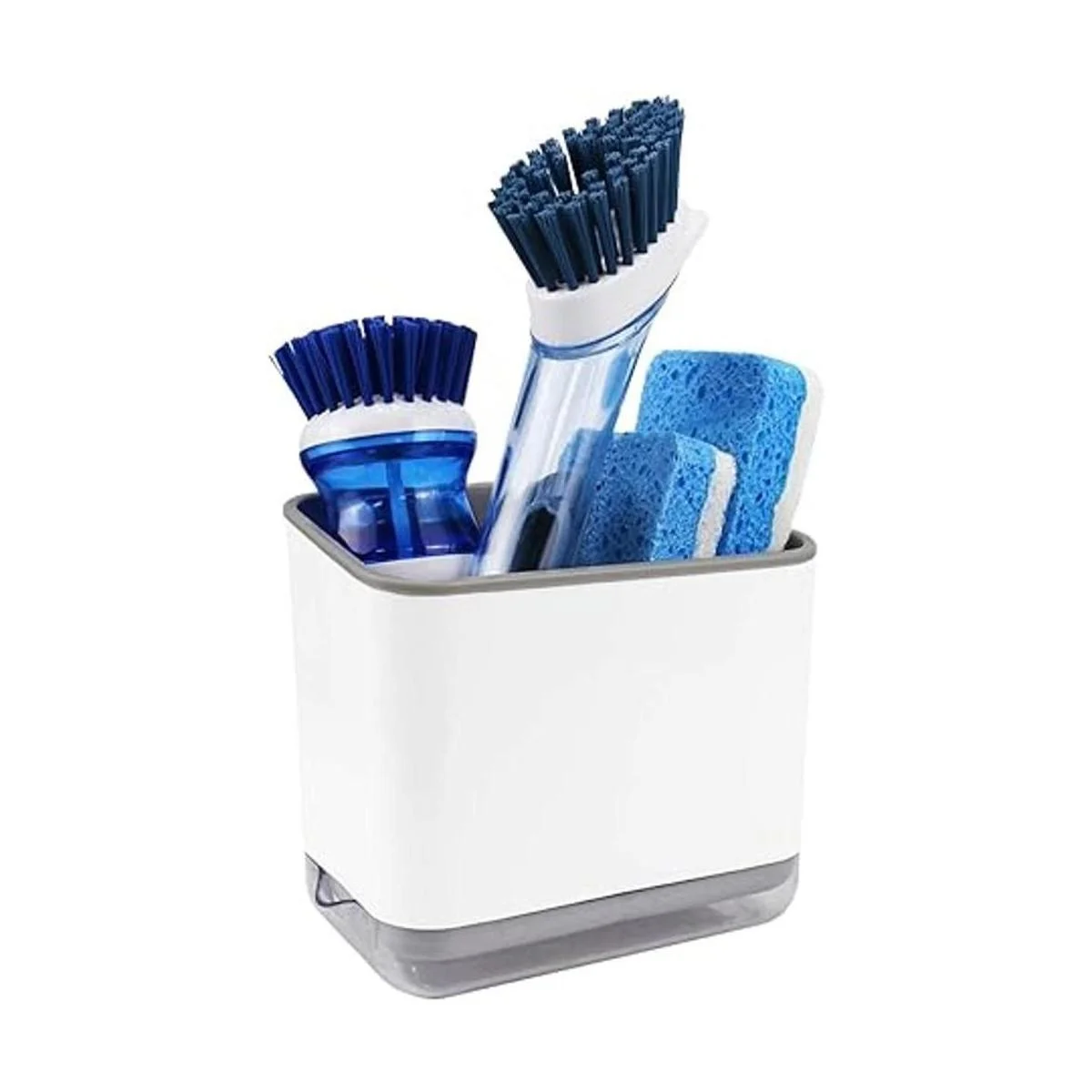 Soporte para fregadero para cepillo y esponja: el organizador para encimera de fregadero tiene 3 compartimentos que mantienen tus dispositivos de limpieza separados y permiten que se sequen rápidamente, hay dos ranuras para cepillos y otras herramientas de mango largo para mantenerlos rectos, un compartimento más grande para esponjas, estropajos de acero y botellas de jabón pequeñas.
