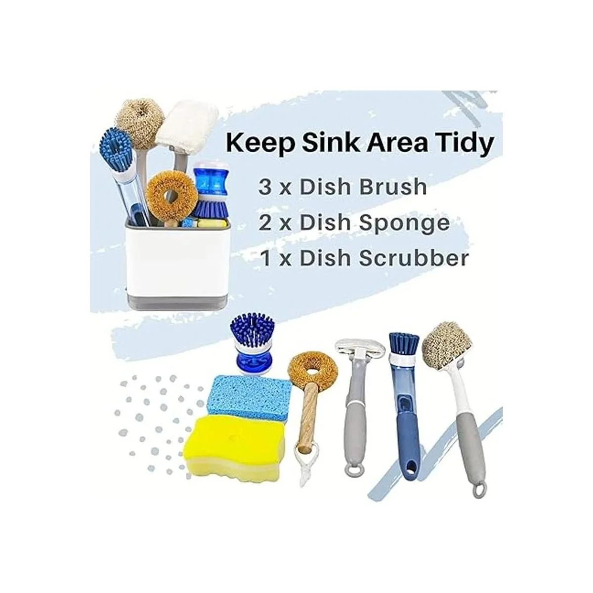 rea de fregadero sin desorden: el soporte de esponja de fregadero de plástico se puede colocar en el mostrador en lugar de fijar al fregadero con ventosas, no se interpondrá en el camino de otras actividades en el fregadero de la cocina, nunca se cae ni se oxida. Ayuda a mantener las herramientas de lavado de platos en un solo lugar y mantiene la zona del fregadero ordenada. Nota: los cepillos y esponjas no están incluidos
