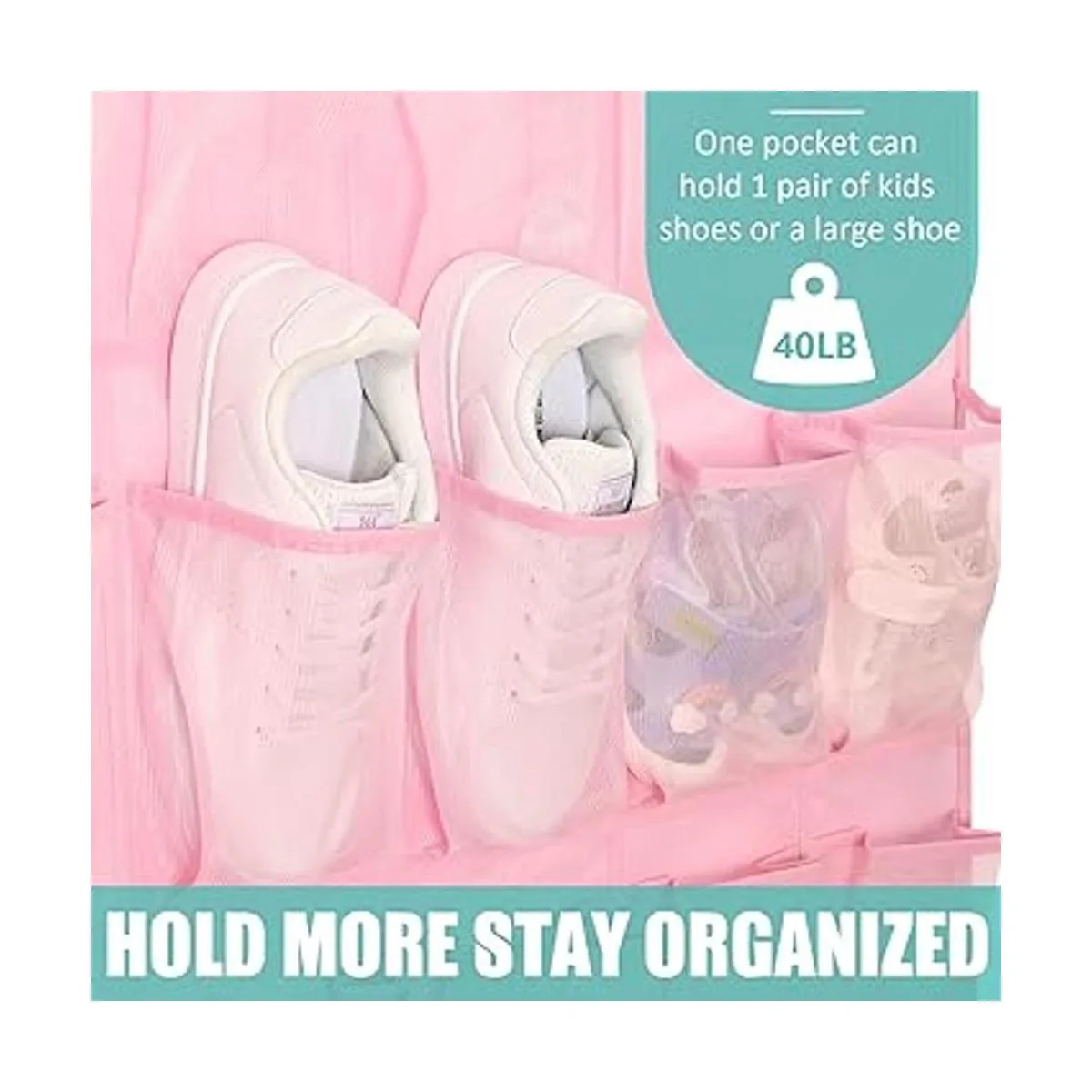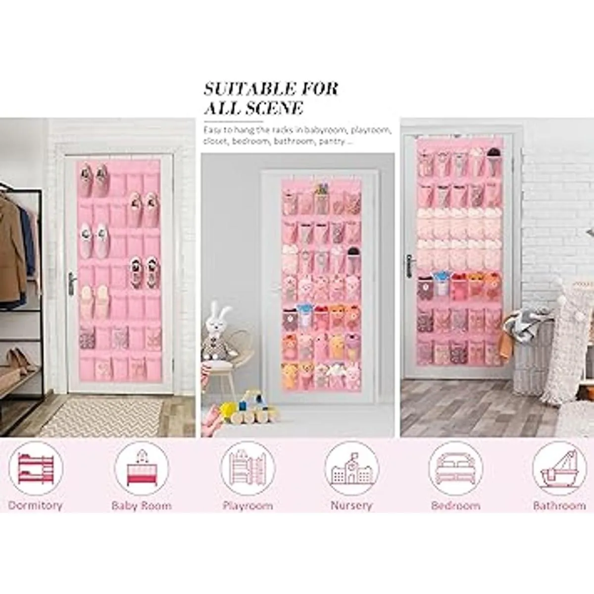 Multifunción y se adapta a la mayoría de puertas: perfecto para entrada, dormitorio, baño, cocina, habitación del bebé, guardería. El estilo rosa también permite que la habitación del niño cree un ambiente cálido y lindo, una decoración de habitación de niños pequeños para niñas. El tamaño total del organizador de almacenamiento de zapatos para niñas y mujeres mide 67.7 x 26.4 pulgadas, diseñado para puertas más altas y anchas para almacenar cualquier cosa, como animales de peluche de bebé, accesorios de lazo, suministros de manualidades, artículos de despensa, artículos de belleza, accesorios de dormitorio para niñas.
