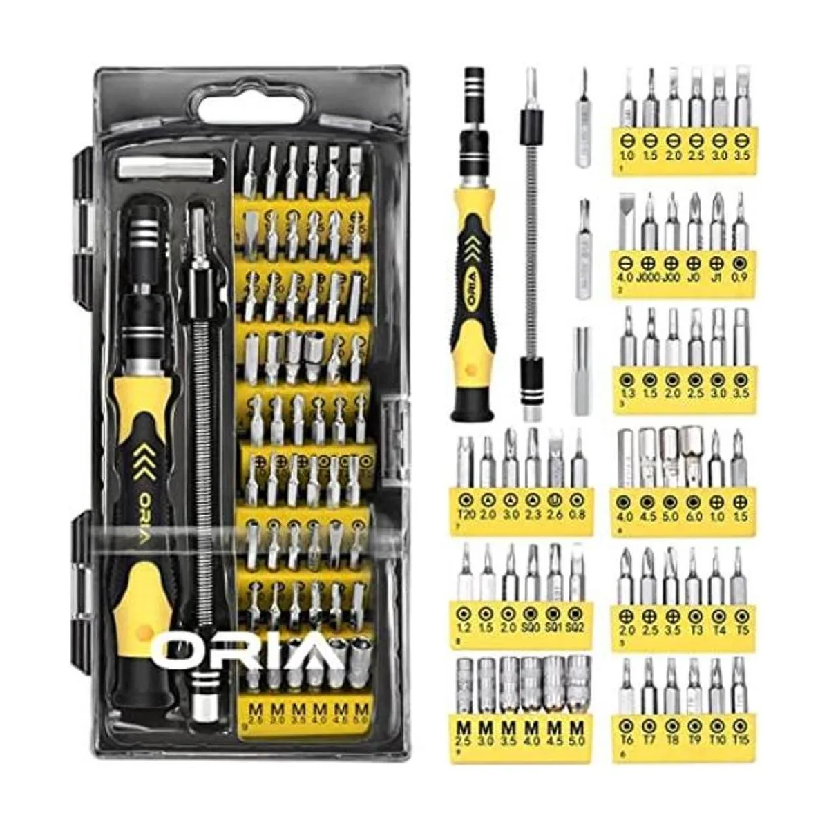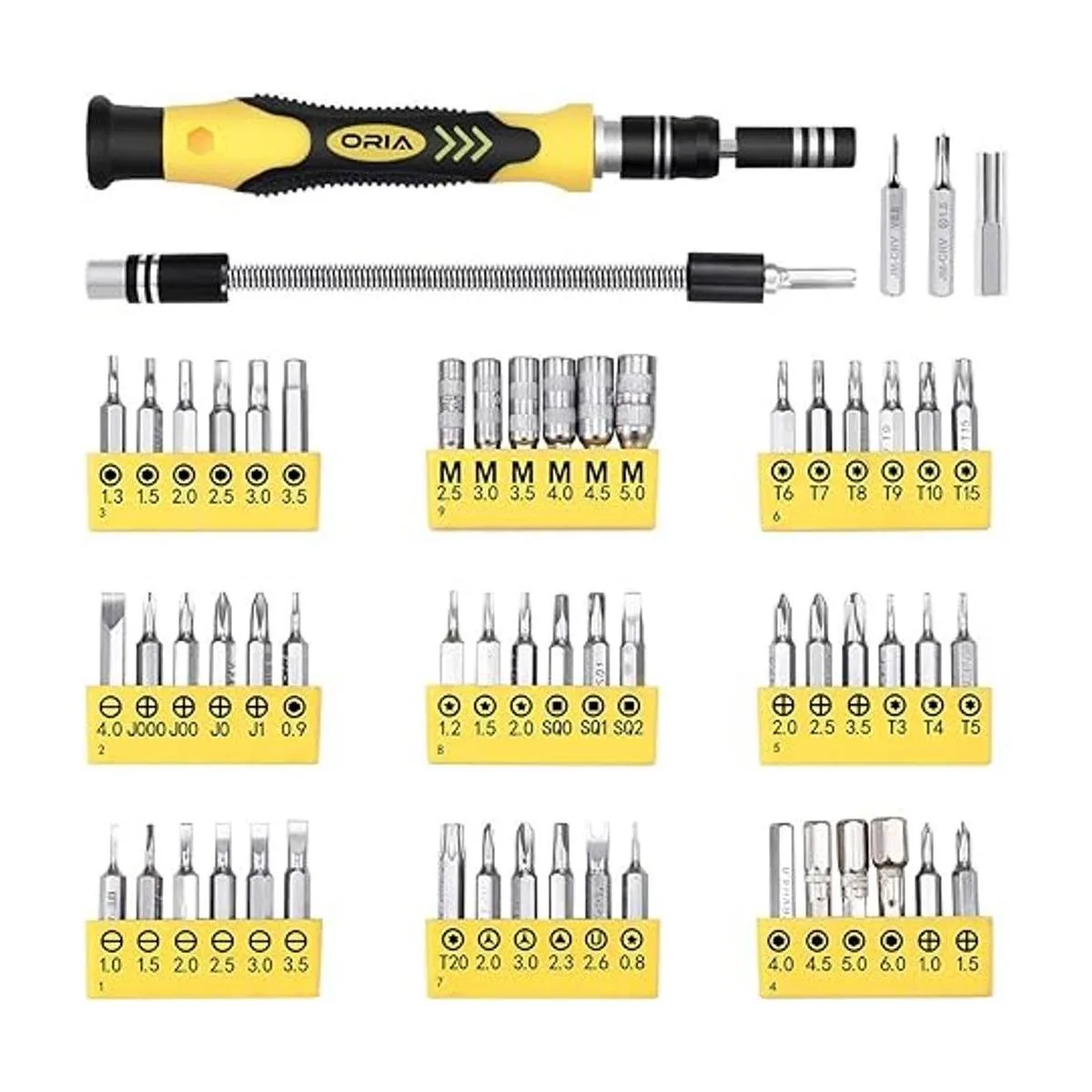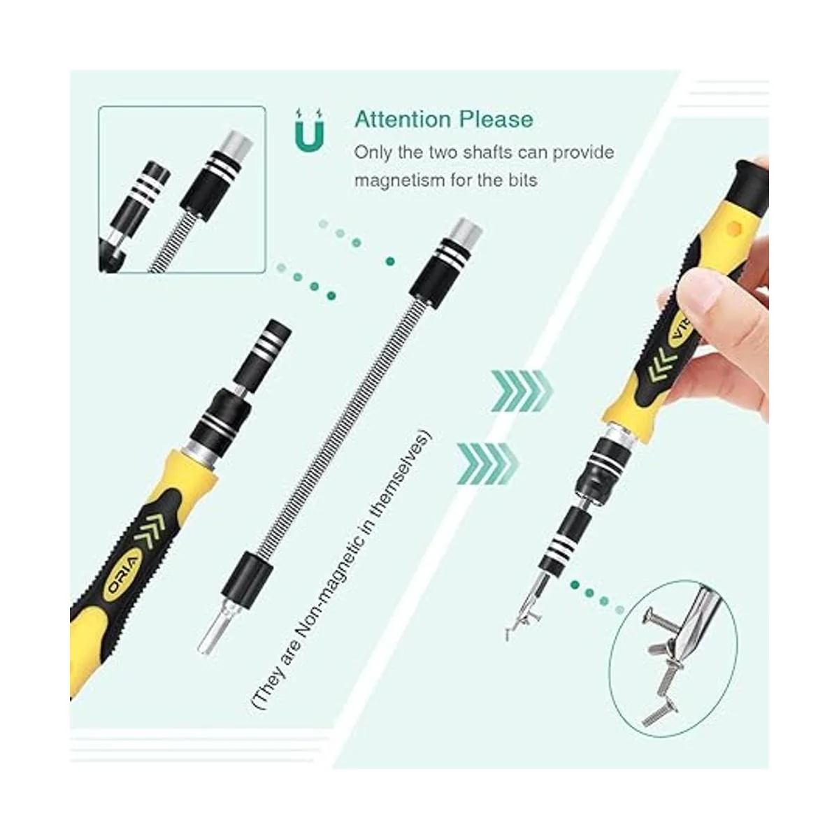 ORIA Juego de destornilladores de precisión, 60 en 1 con juego de destornilladores de 56 puntas, kit de destornillador magnético con eje flexible, barra de extensión para teléfono celular, teléfono inteligente, consola de juegos, tableta, PC, amarillo.
