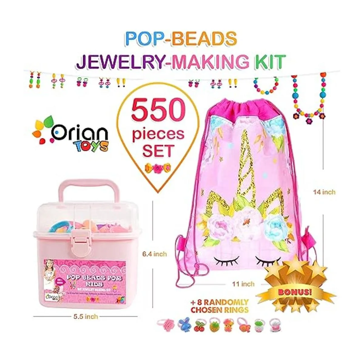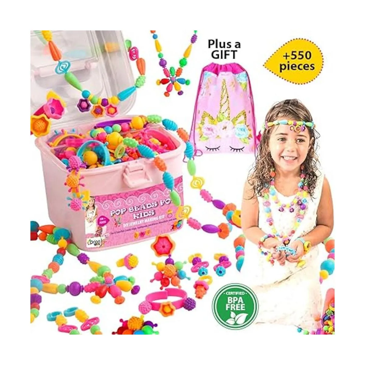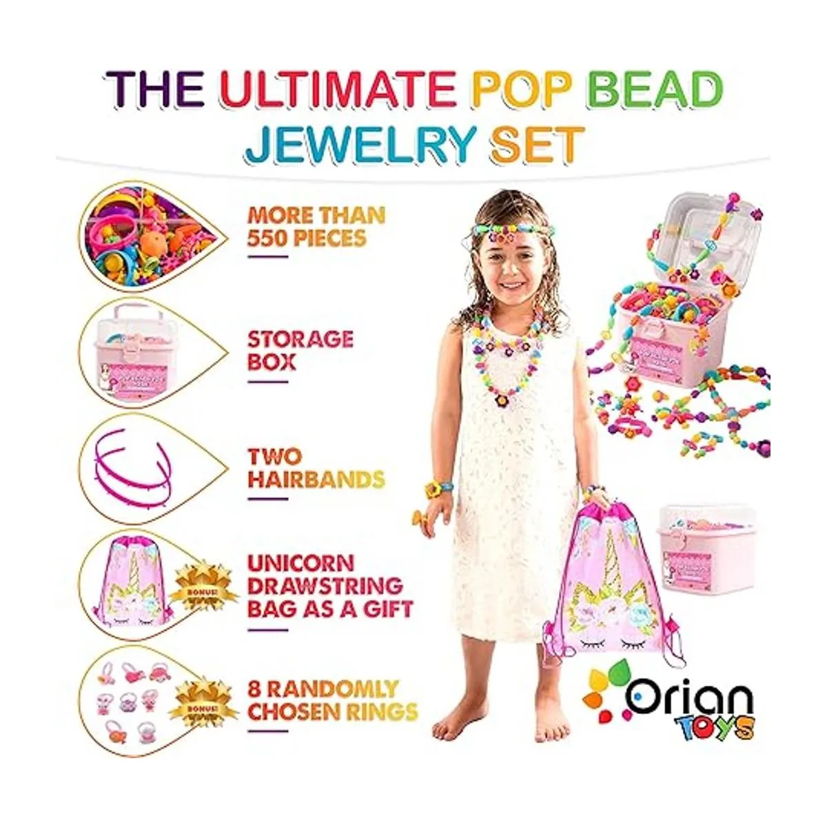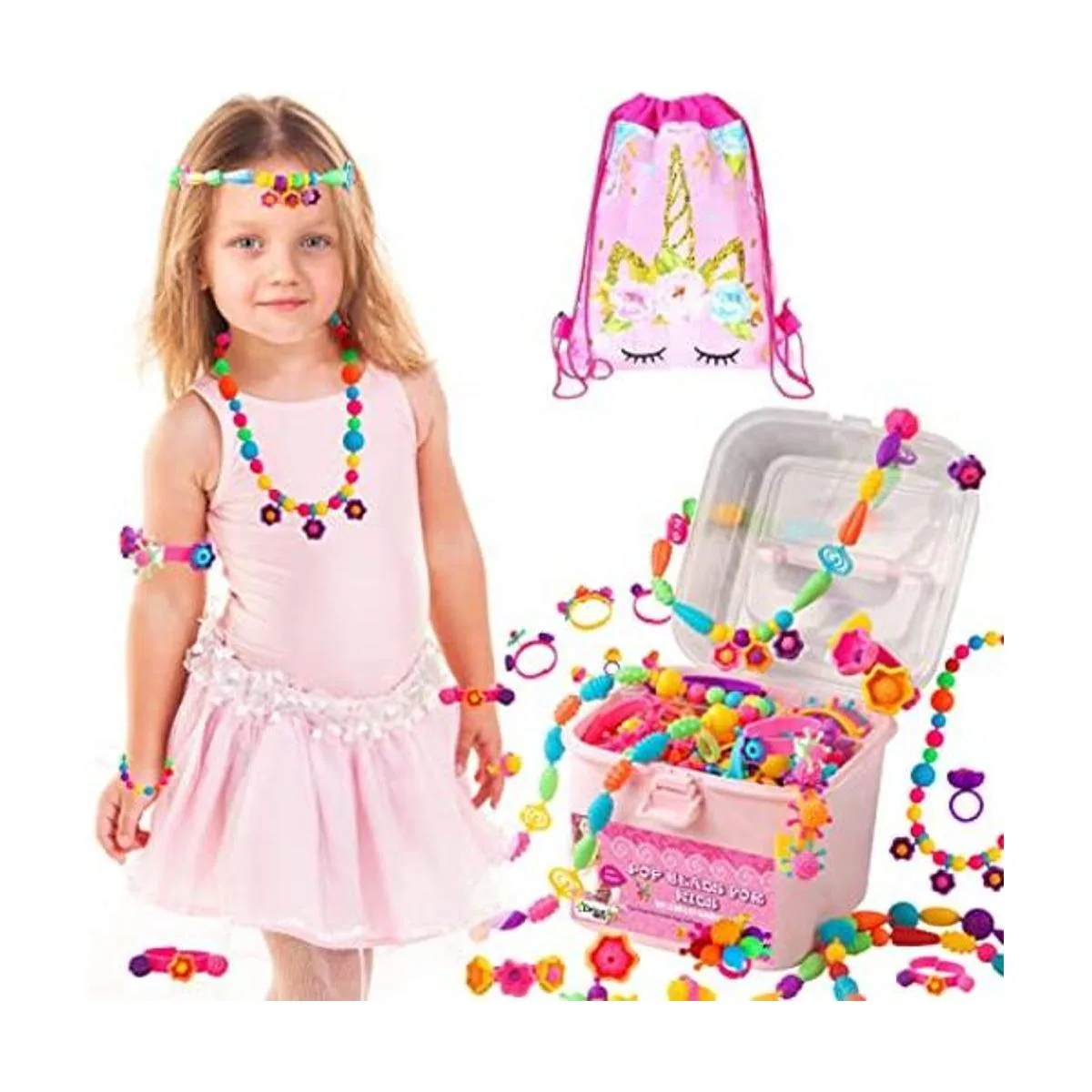 ORIAN Kit de fabricación de joyas para niñas, juego de más de 550 piezas, cuentas pop para niñas de 3 años en adelante, divertidas y coloridas cuentas a presión, kit de fabricación de pulseras, collares y anillos. Gran bolsa de regalo de unicornio colorida