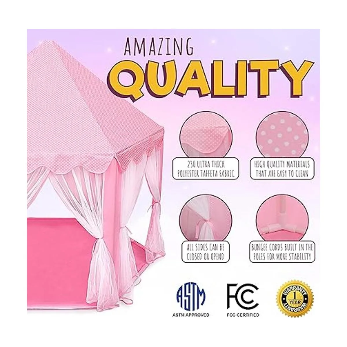 1 en seguridad infantil: certificado ASTM y FCC. Mantener a tus hijos seguros es nuestra primera y principal prioridad en ORIAN. Es por eso que diseñamos nuestra tienda de campaña para niños según los estándares de ataque de la Sociedad Americana de Pruebas y Materiales, lo que ayuda a garantizar que solo se utilicen materias primas de calidad. Descansa tranquilo sabiendo que tus hijos están protegidos de productos químicos nocivos y aspectos de diseños peligrosos con nuestra tienda de campaña de castillo de princesa.