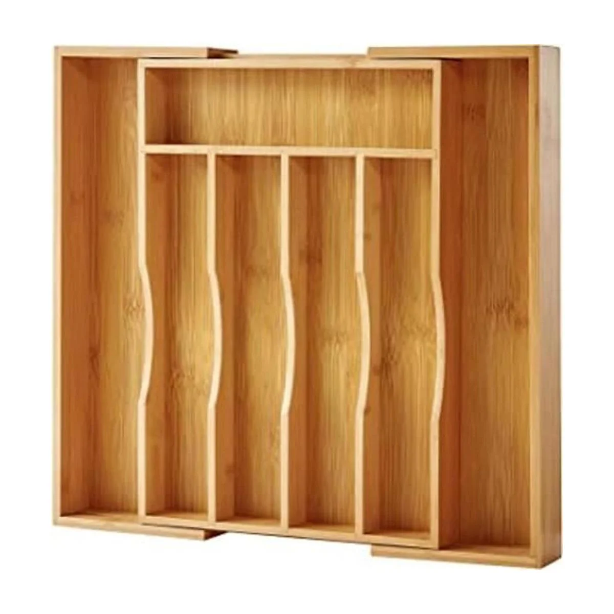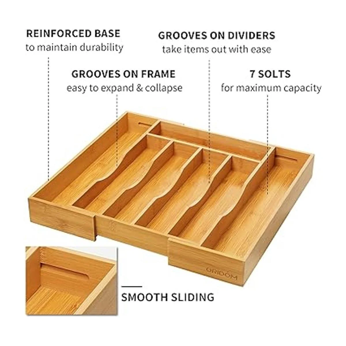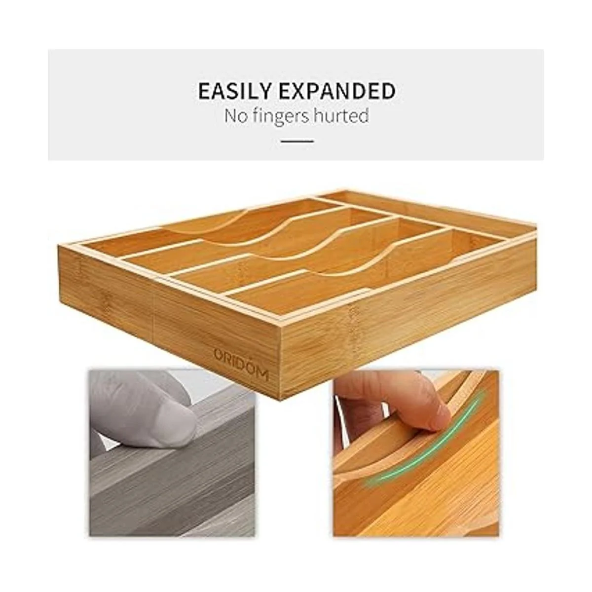 ORIDOM Organizador de cajones de cocina de bambú expandible para cubiertos y utensilios, bandeja ajustable de madera de bambú en cajón para cubiertos y cubiertos en la cocina, natural