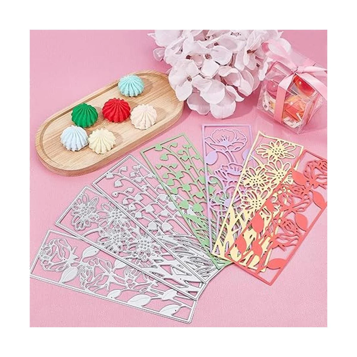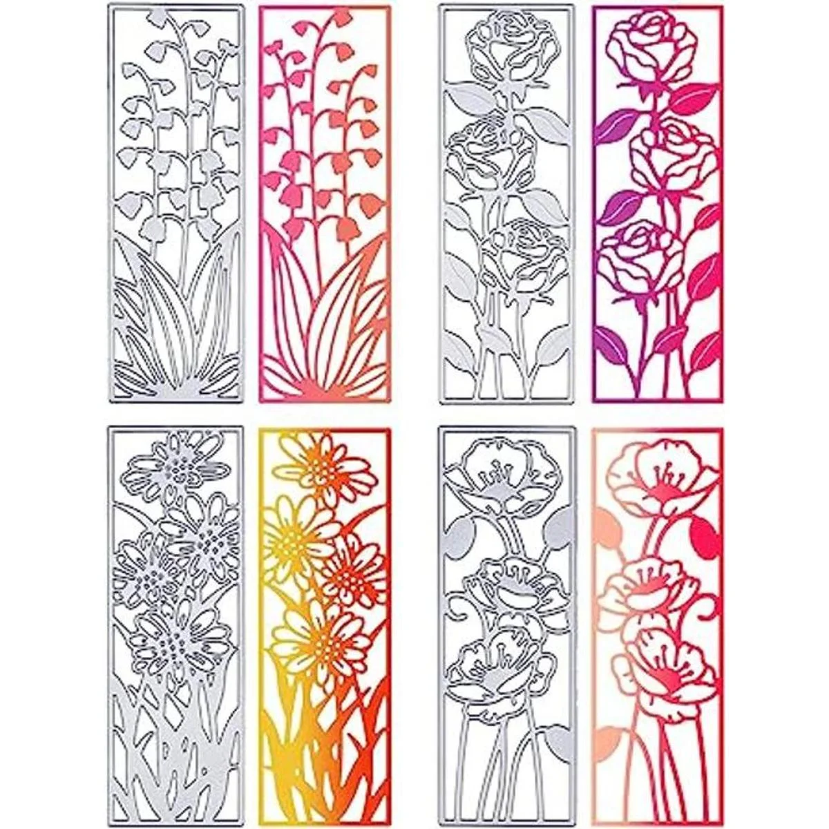 Marco de flores delgado: marco de flores original de 4 estilos que corta aproximadamente 2 x 6 pulgadas, delicado y exquisito, agradable para hacer tarjetas marcapáginas o hacer cubiertas de tarjetas temáticas florales.