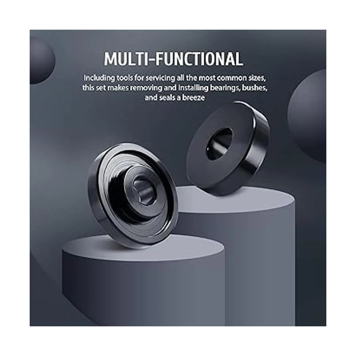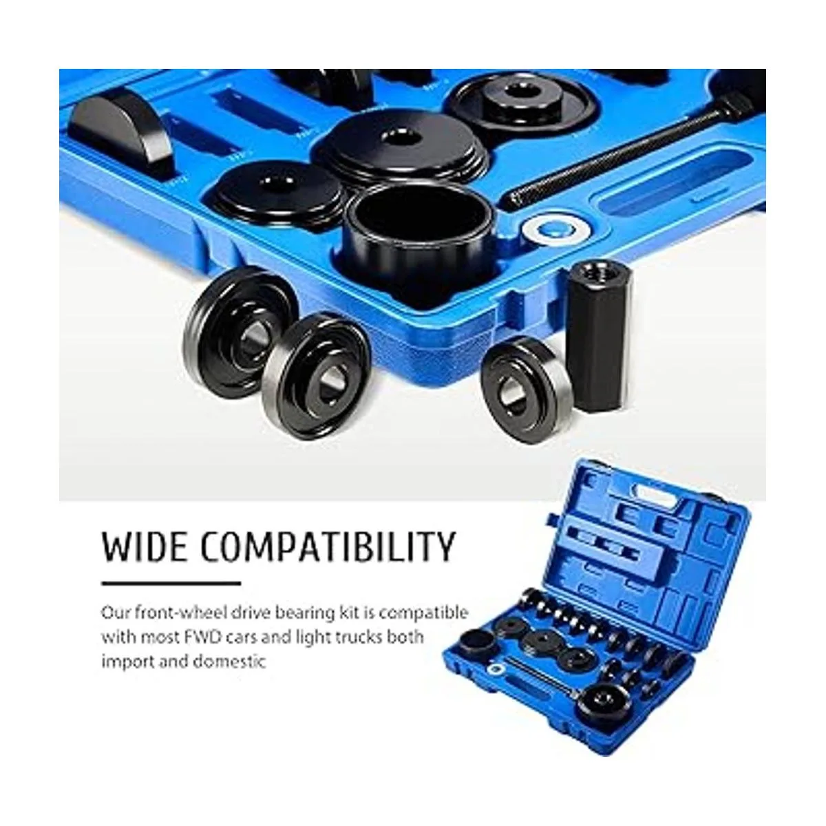 Kit completo de 23 piezas: todo lo que necesitas para una simple extracción e instalación de rodamientos de ruedas en vehículos de tracción delantera. Con 12 adaptadores de buje, 4 fundas con placas de manga, un instalador de cubo de rueda y más, terminarás los trabajos más rápido y fácil como nunca antes.