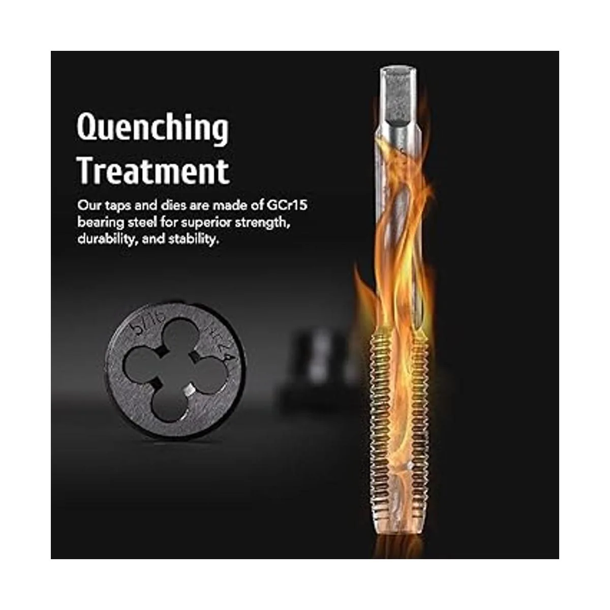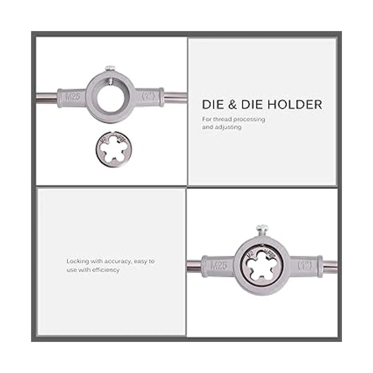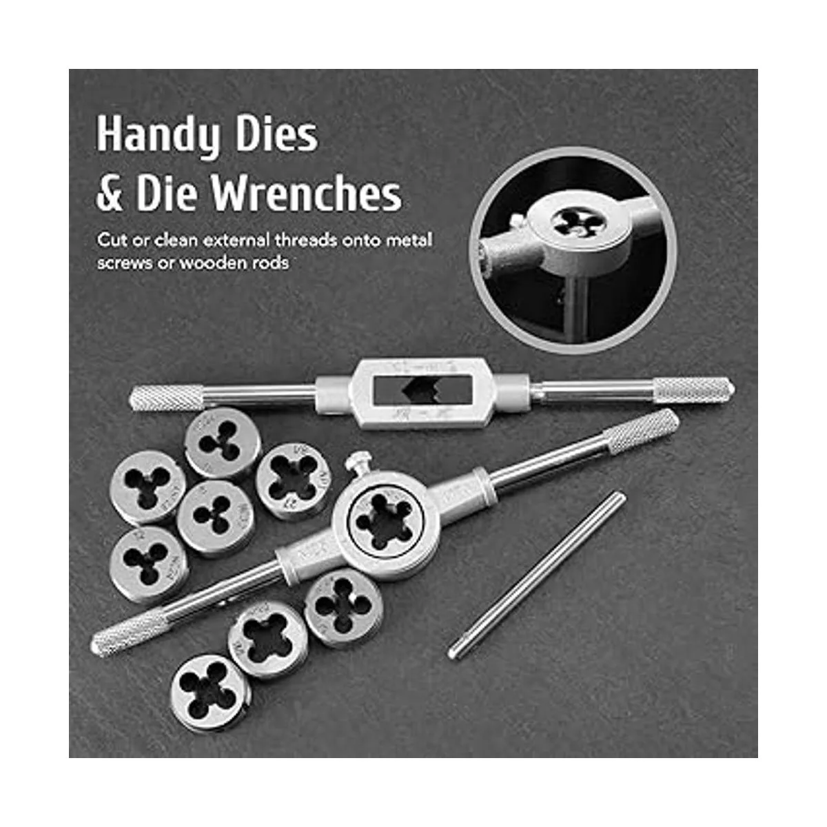 Accesorios completos: Este kit de herramientas premium incluye 17 machuelos y tarrajas milimétricas y 17 machuelos y tarrajas SAE de estándar americano, maneral ajustable de mango largo para tarraja compatible con roscas exteriores de hasta 1 pulgada de diámetro 25 mm, maneral ajustable para machuelo compatible con 1/16 pulgada 1/2 pulgada M3 12, llave para tarraja con mango en T compatible con 1/16 pulgada 1/4 pulgada M3 6, y un calibrador de roscas para medir el paso de rosca.