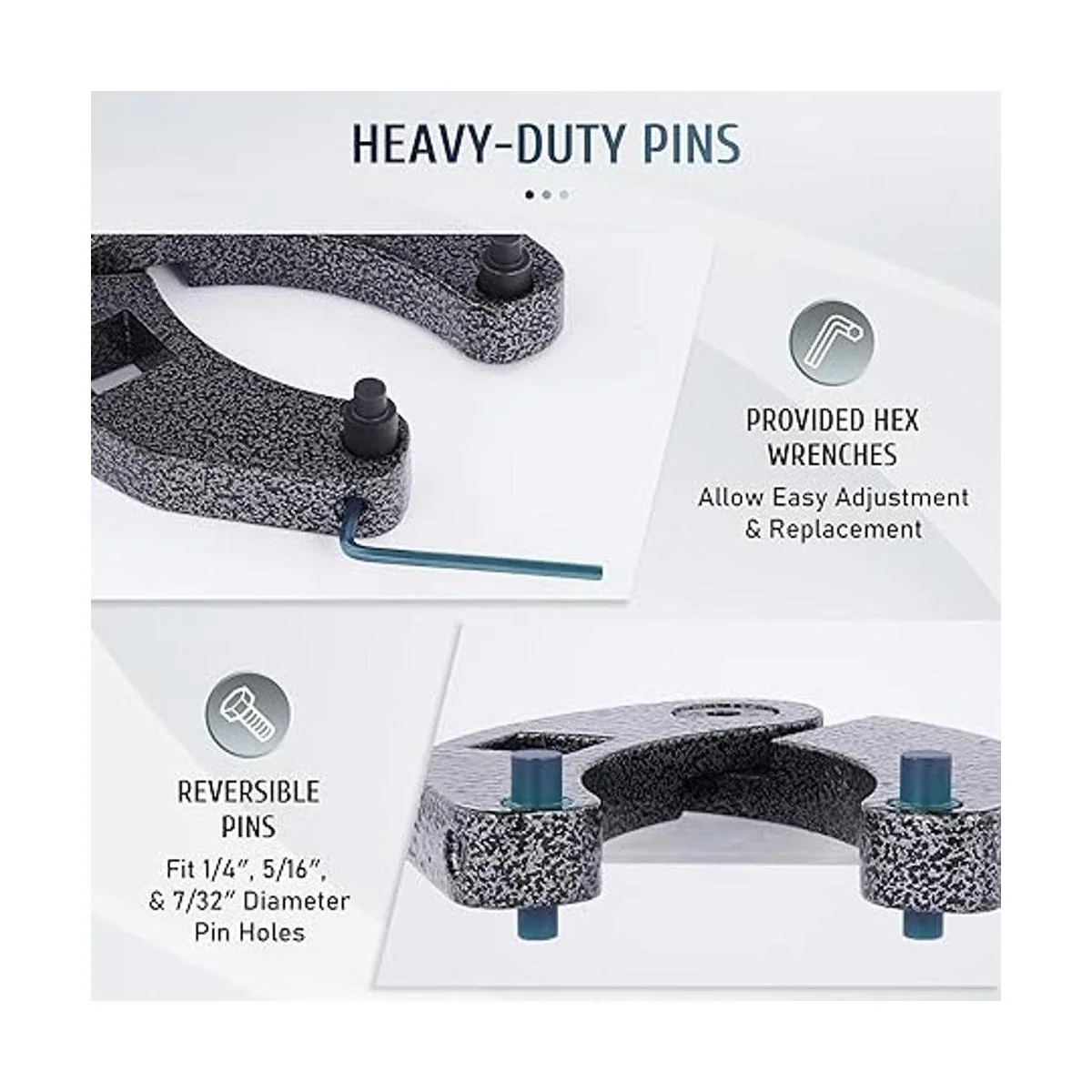 Muy versátil: estas dos llaves ajustables de alta resistencia sellan firmemente las tuercas de prensaestopas de 2 a 6 pulgadas y 1 a 33/4 pulgadas respectivamente, mientras que permiten un uso reversible para adaptarse a agujeros de pin de 1/4, 5/16 y 7/32 pulgadas