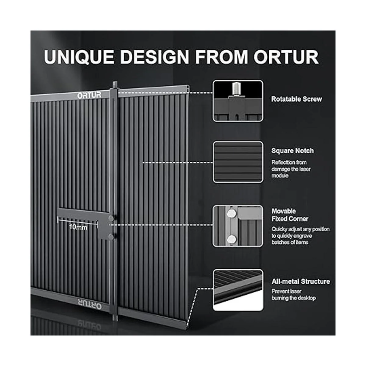 Primer panel de trabajo de grabado empalmable en todo el mundo: la plataforma de grabado ORTUR tiene un diseño de fijación de metal antideslizante con esquina fija móvil, que no solo puede fijar varios tamaños de tallados, sino que también puede ajustar rápidamente cualquier posición para hacer el sueño, graba rápidamente lotes de artículos se hacen realidad. El diseño empalmable hace que sea posible montar dos plataformas de grabado juntas para satisfacer tus necesidades de diferentes tamaños.