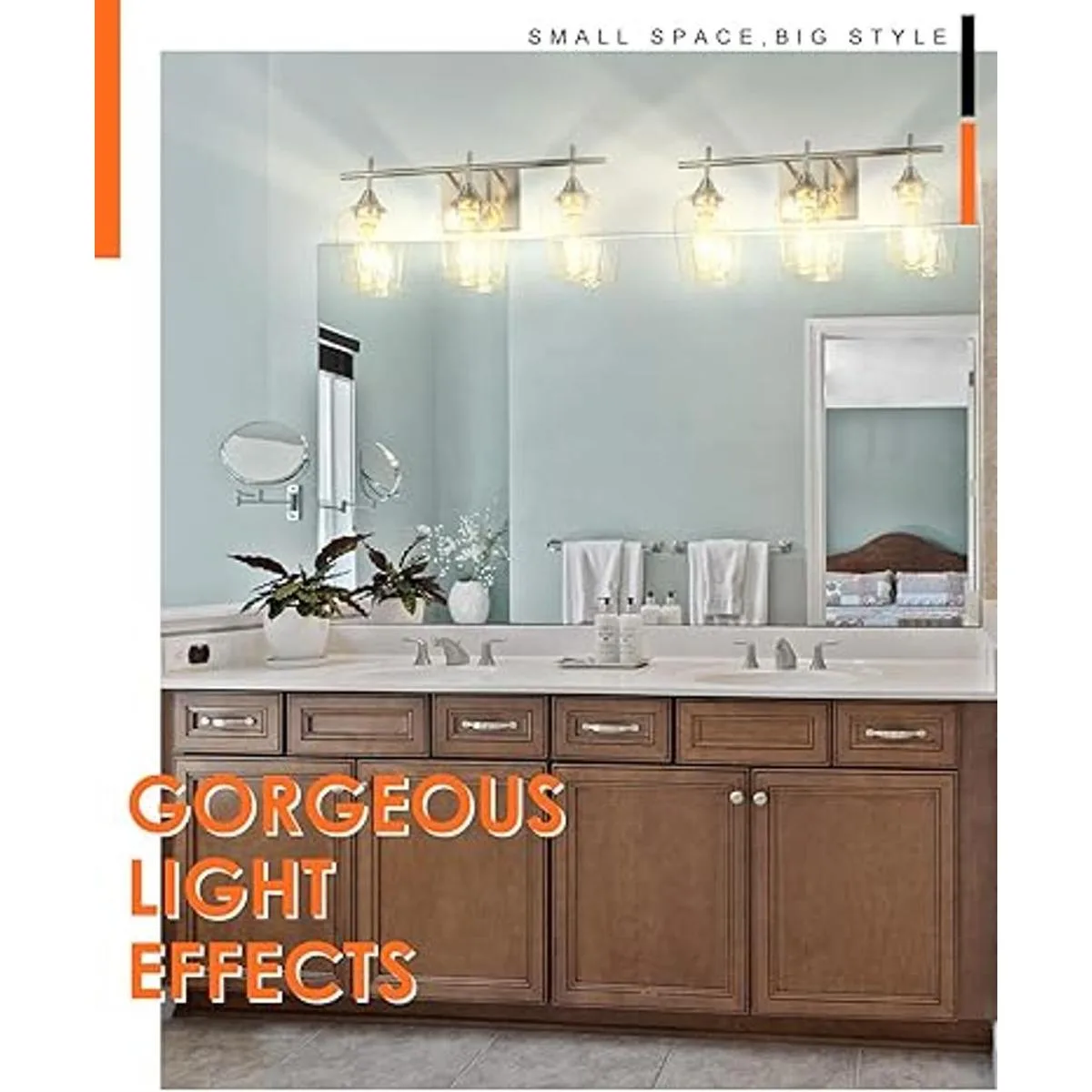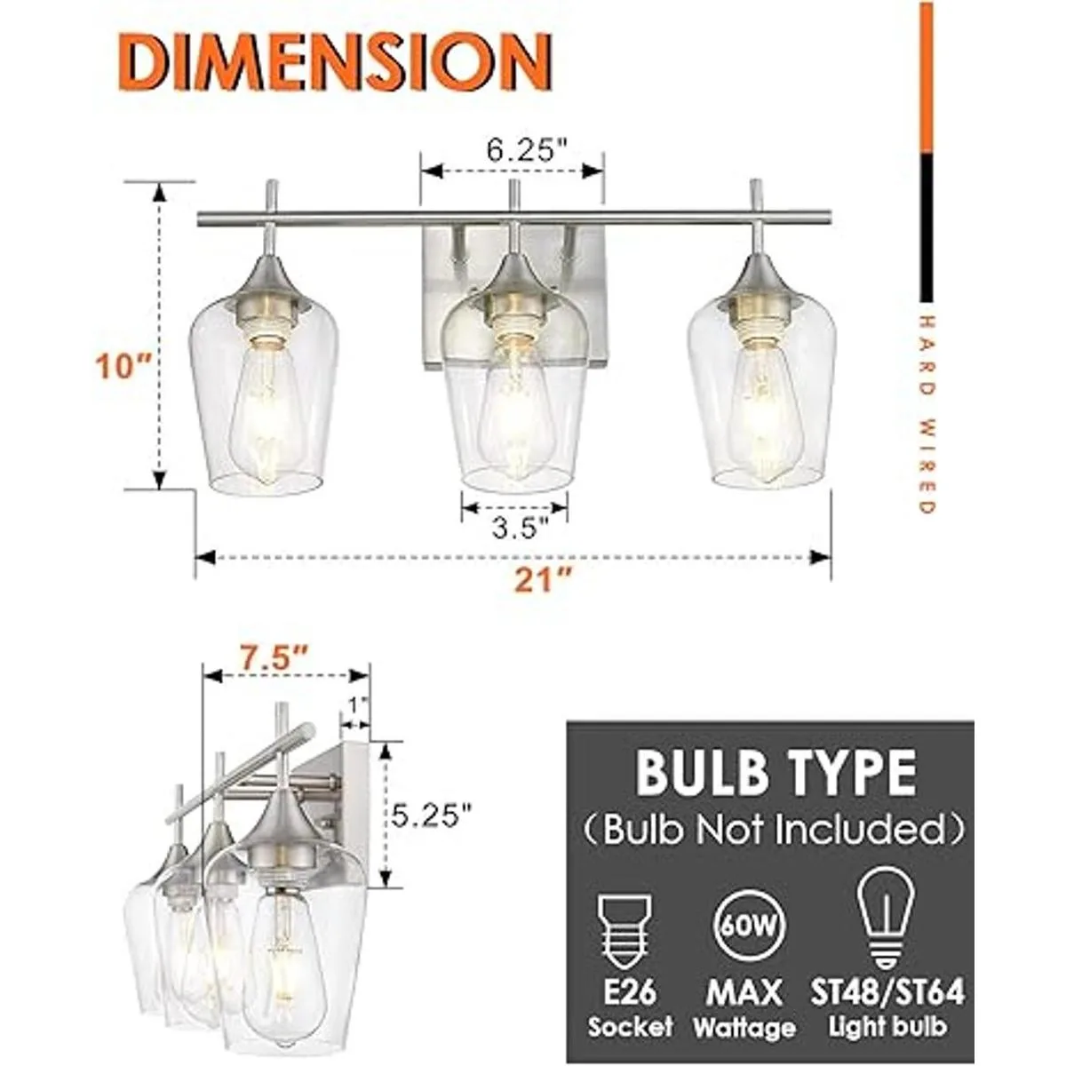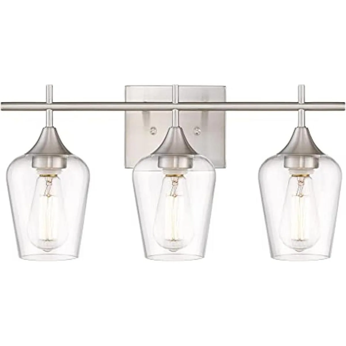 Osimir Lámpara de baño, moderna casa de campo de 3 luces para tocador de baño, lámpara de pared interior en acabado de níquel satinado, pantalla de vidrio transparente, 21 pulgadas de ancho x 7.5 pulgadas de alto, WL91673C