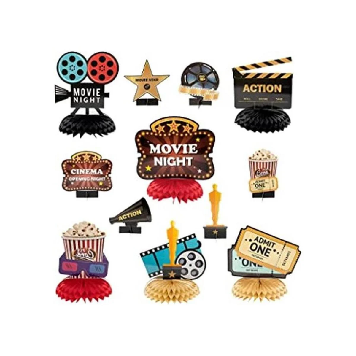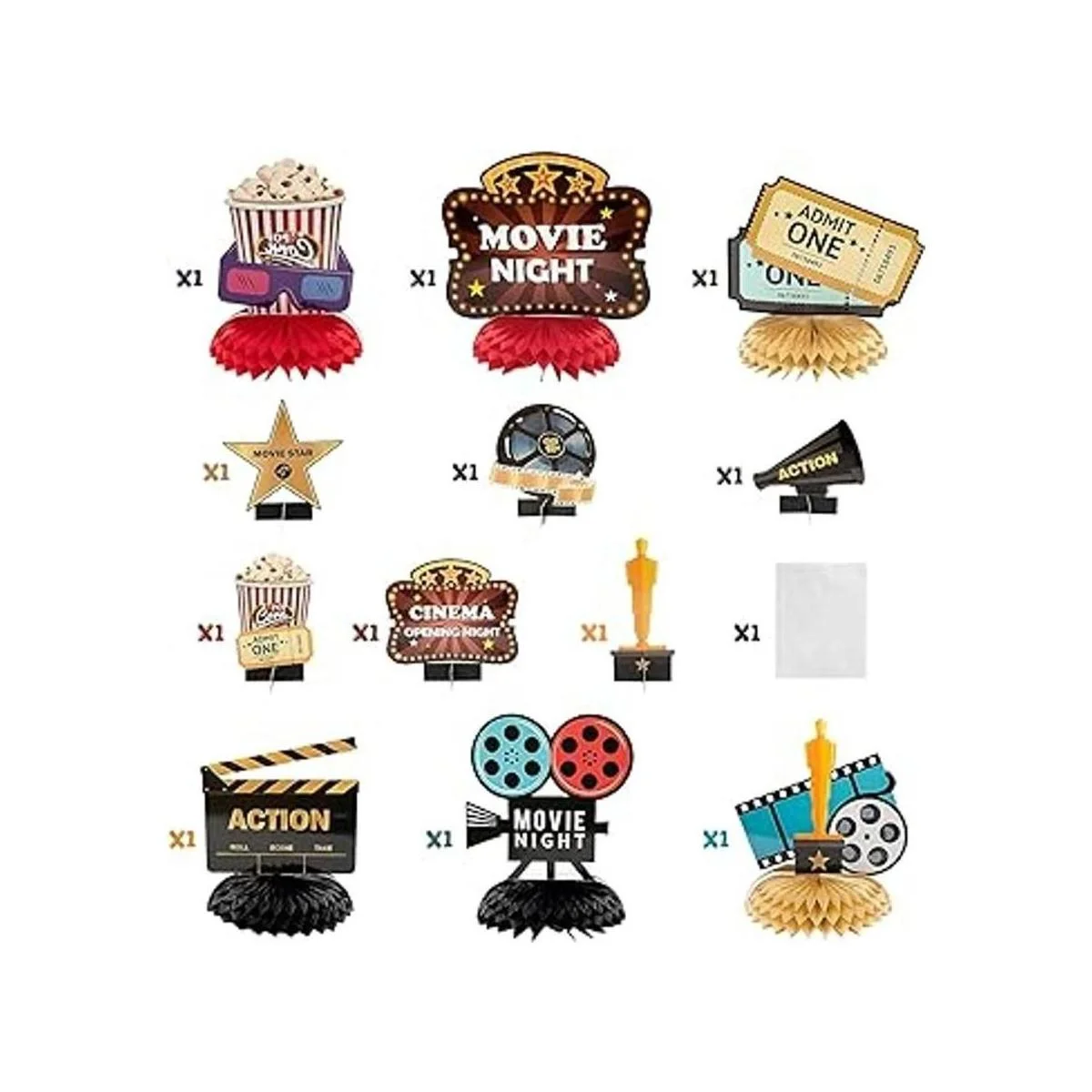 OSNIE 12 piezas de centro de mesa con temática de noche de película, decoración de mesa, suministros de decoración de fiesta, estrella de cine, paseo de la fama, proyector de boletos, palomitas de maíz, decoración de mesa para ceremonia de premios Oscar