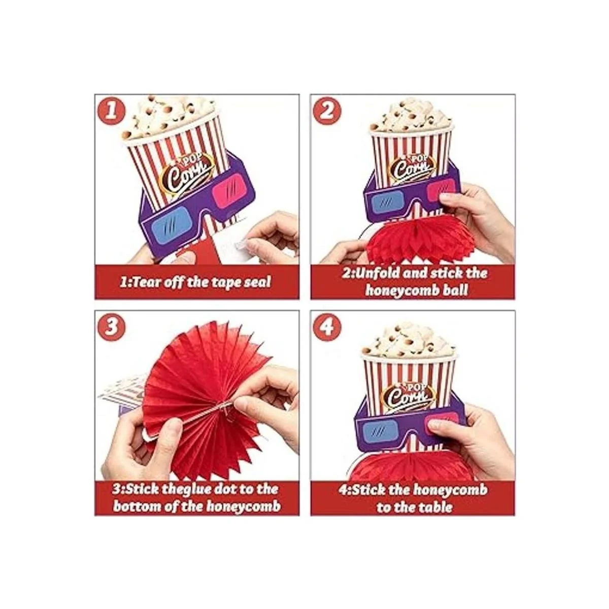 Contenido del paquete: viene con 6 centros de mesa de panal temáticos de noche de película, 6 decoraciones de mesa del mismo tema y 1 hoja de punto de pegamento. Son suficientes para una fiesta, y si quieres comprar otras decoraciones para acompañarlas, puedes ir a nuestra página de inicio para comprarlas.