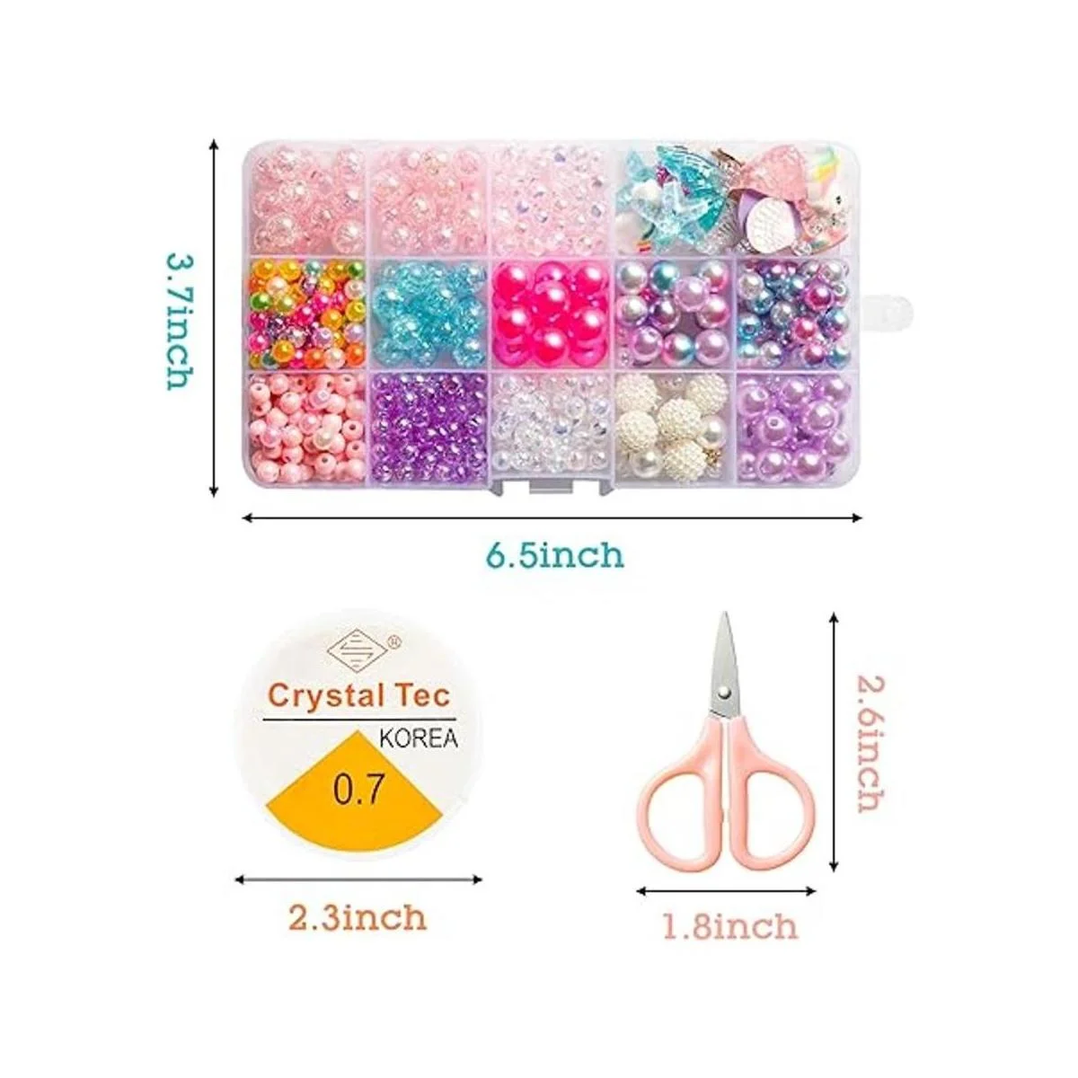 Contenido del paquete: incluye más de 400 cuentas, 16 abalorios, 2 colgantes de perlas, 1 tijera de seguridad infantil y 1 rollo de cuerda de cristal elástica. Se guarda en una caja de plástico transparente.