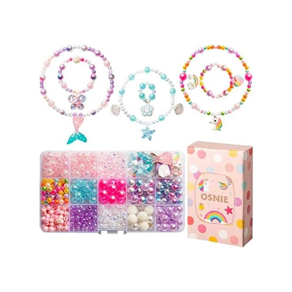 OSNIE Kit de fabricación de joyas de cuentas para niños y niñas con concha de estrella de mar de sirena, unicornio, arco iris, mariposa, corazón, cuentas para pulseras, anillos, collares, kits de cuentas de creatividad, manualidades artísticas, 400 unidades