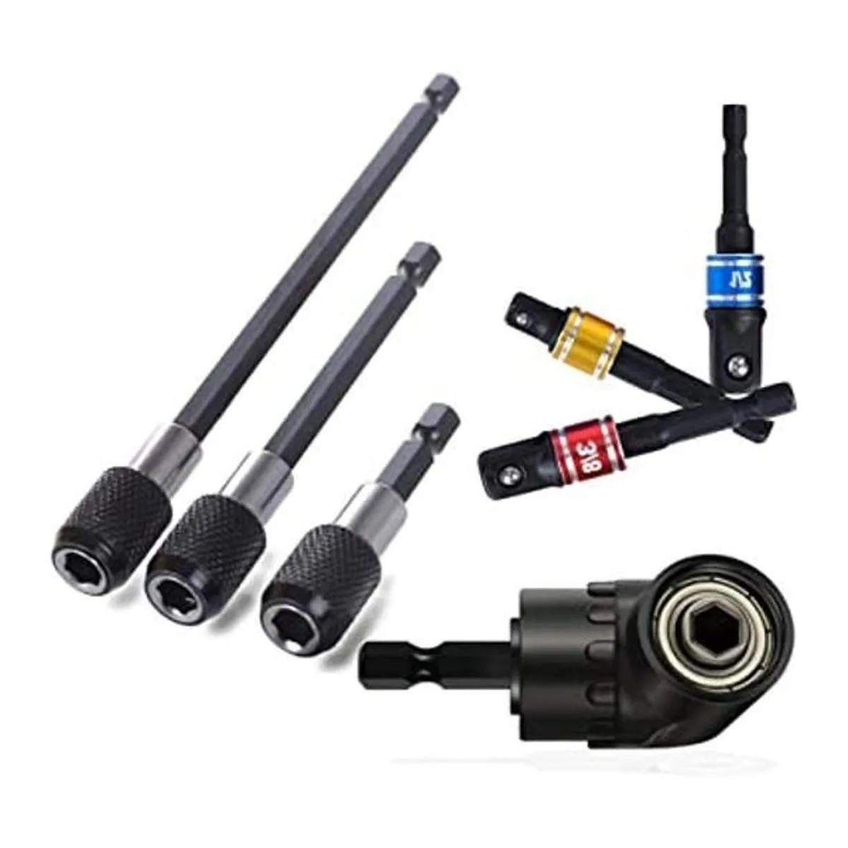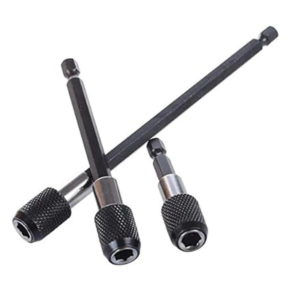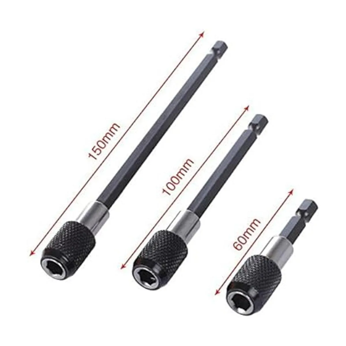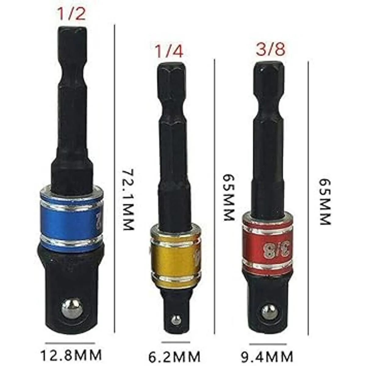 Application 1/4 Inch Hex Shank Magnetic Extension Chuck Adapter Quick Release Bar Socket Screwdriver Bit Holder 60mm/ 100mm/ 150mm Length,Suitable for electric, pneumatic screwdrivers and other screwdriver bits of power tools, drill extended. 3Pcs black socket adapter impact with colorful ring set 1/4 drive adapter, 3/8 drive adapter, and 1/2 drive adapter and each with a 1/4 inch hex shank driver socket adapter set .Connect impact sockets/socket wrenches/sockets bits/driver sockets to
