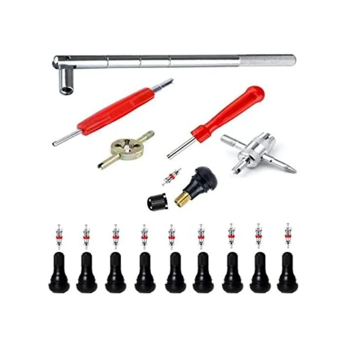 Función: juego de herramientas 25 en 1 para extraer válvulas de neumáticos. Para una rápida extracción o instalación de inserciones de válvula de neumático y reparación de neumáticos. Funciona con cualquier rueda que utilice un vástago de válvula estándar de 0.5 in. Con 10 vástagos de válvula reemplazables y múltiples llaves, satisface tus diferentes necesidades.