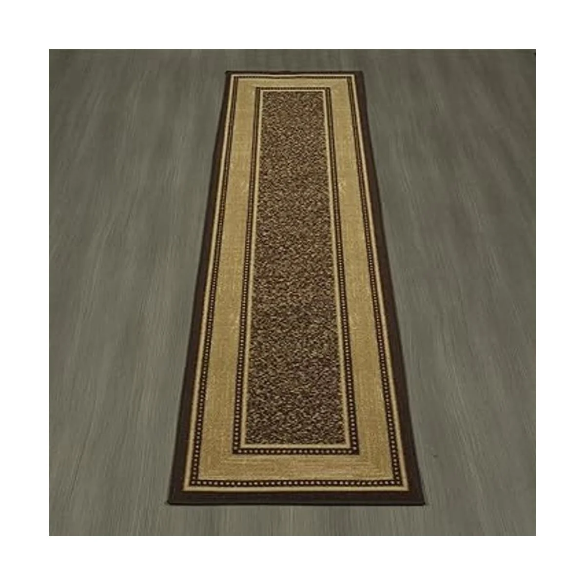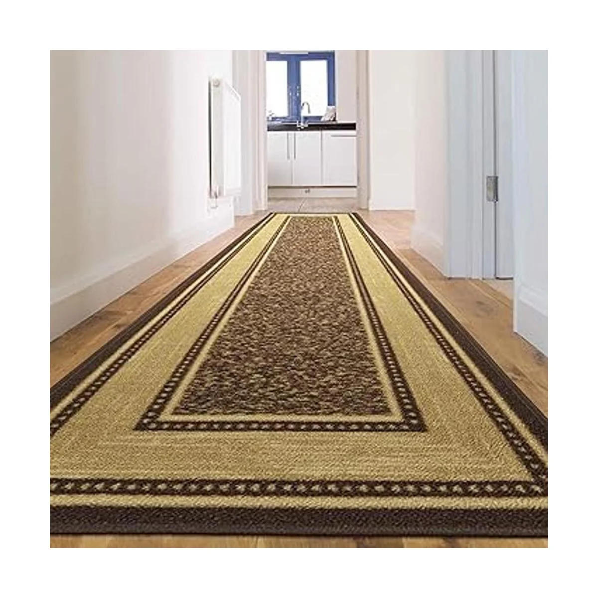 Color: La alfombra de pasillo marrón cuenta con un elegante y sofisticado diseño de bordes en tonos tostados de marrón chocolate medio completado con un borde beige bien definido.