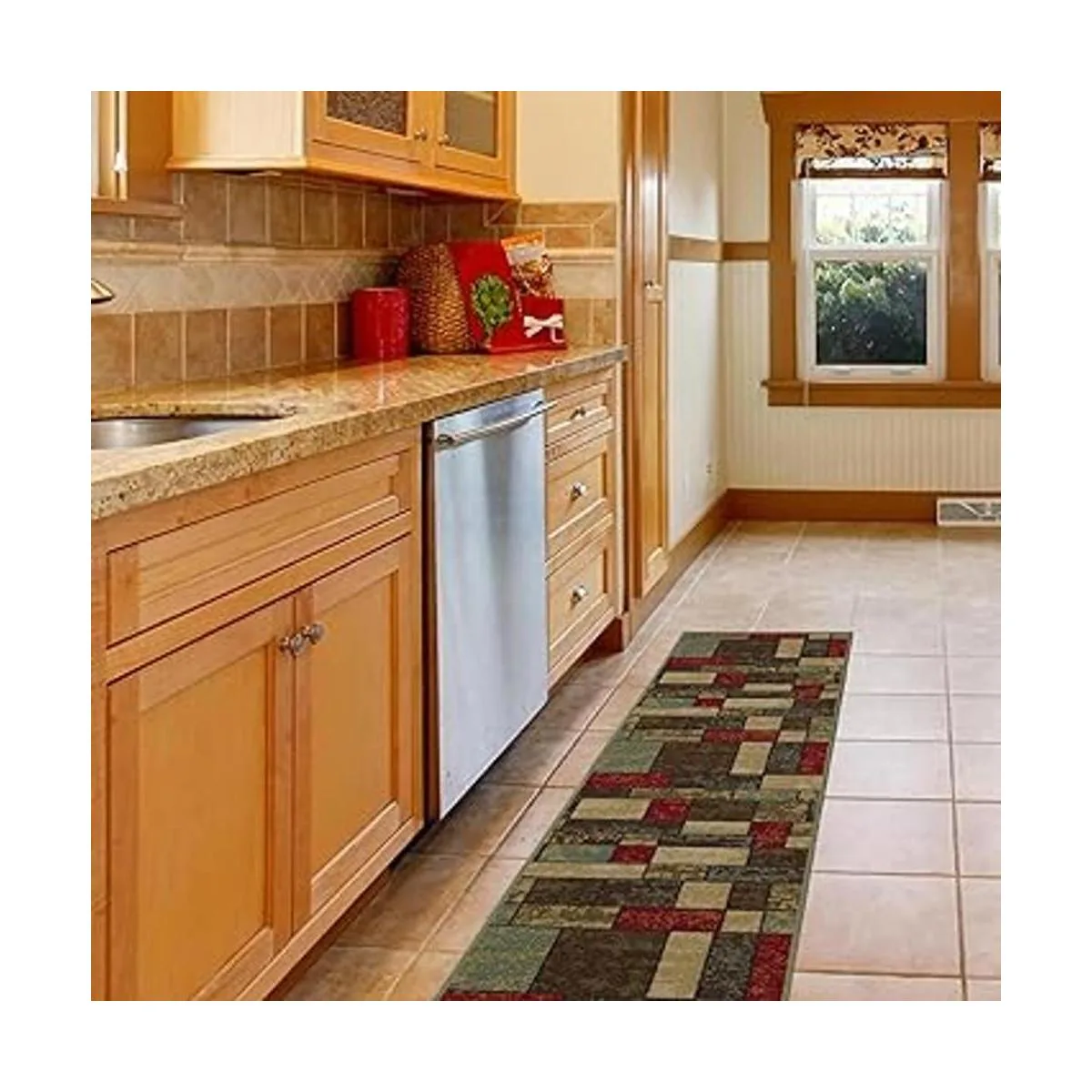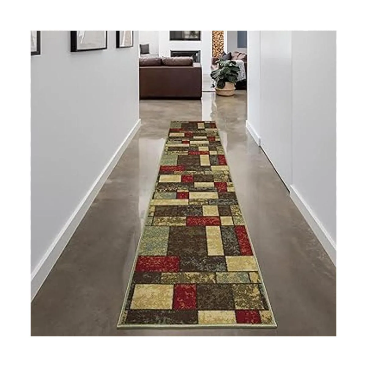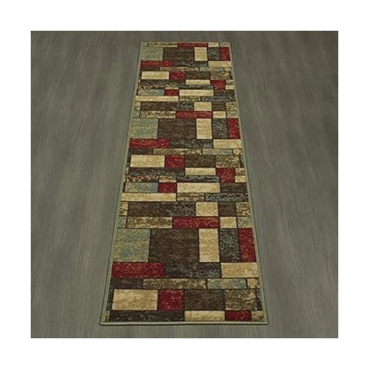 Color: alfombra multicolor con un diseño elegante con cajas en tonos terracota rojo, crema, beige, verde y marrón oscuro.