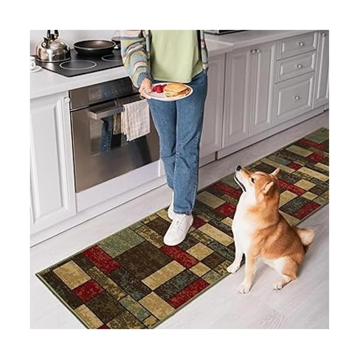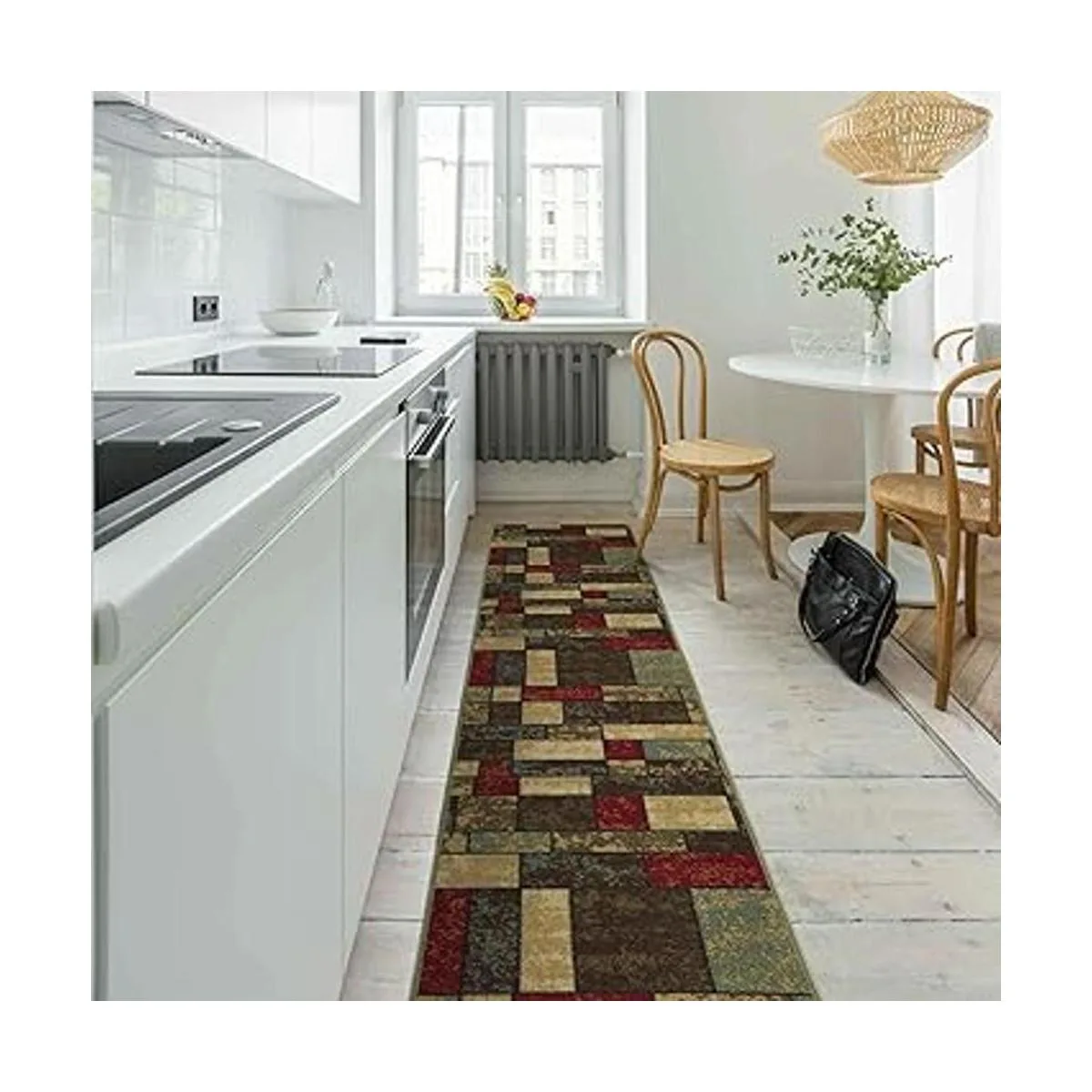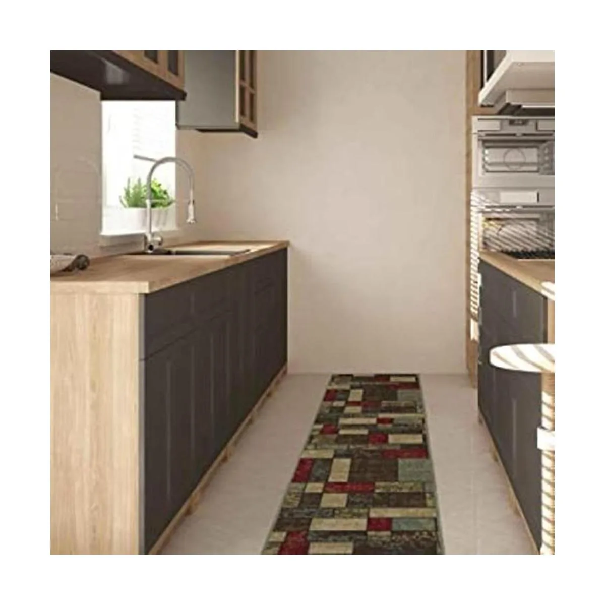 Color: alfombra multicolor con un diseño elegante con cajas en tonos terracota rojo, crema, beige, verde y marrón oscuro.