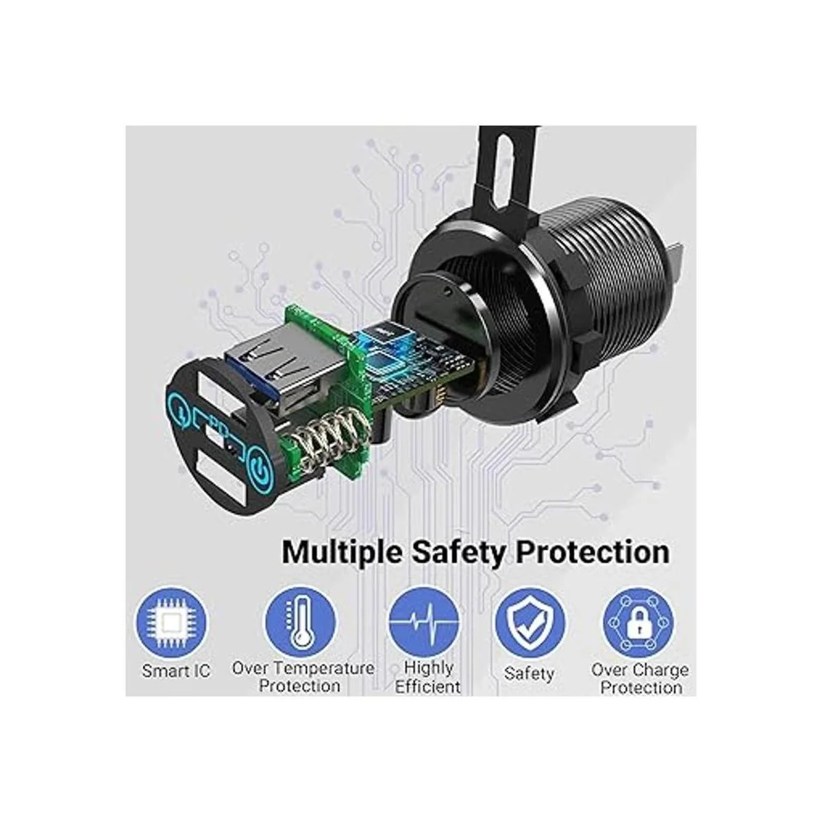 Interruptor táctil de encendido/apagado Esta toma USB de 12 V está diseñada con un interruptor táctil y tiene una función de memoria para recordar el último estado de uso. El chip IC inteligente integrado puede proteger el dispositivo de sobretensión, sobrecalentamiento, sobrecarga o cortocircuito. Certificado por CE y ROHS.