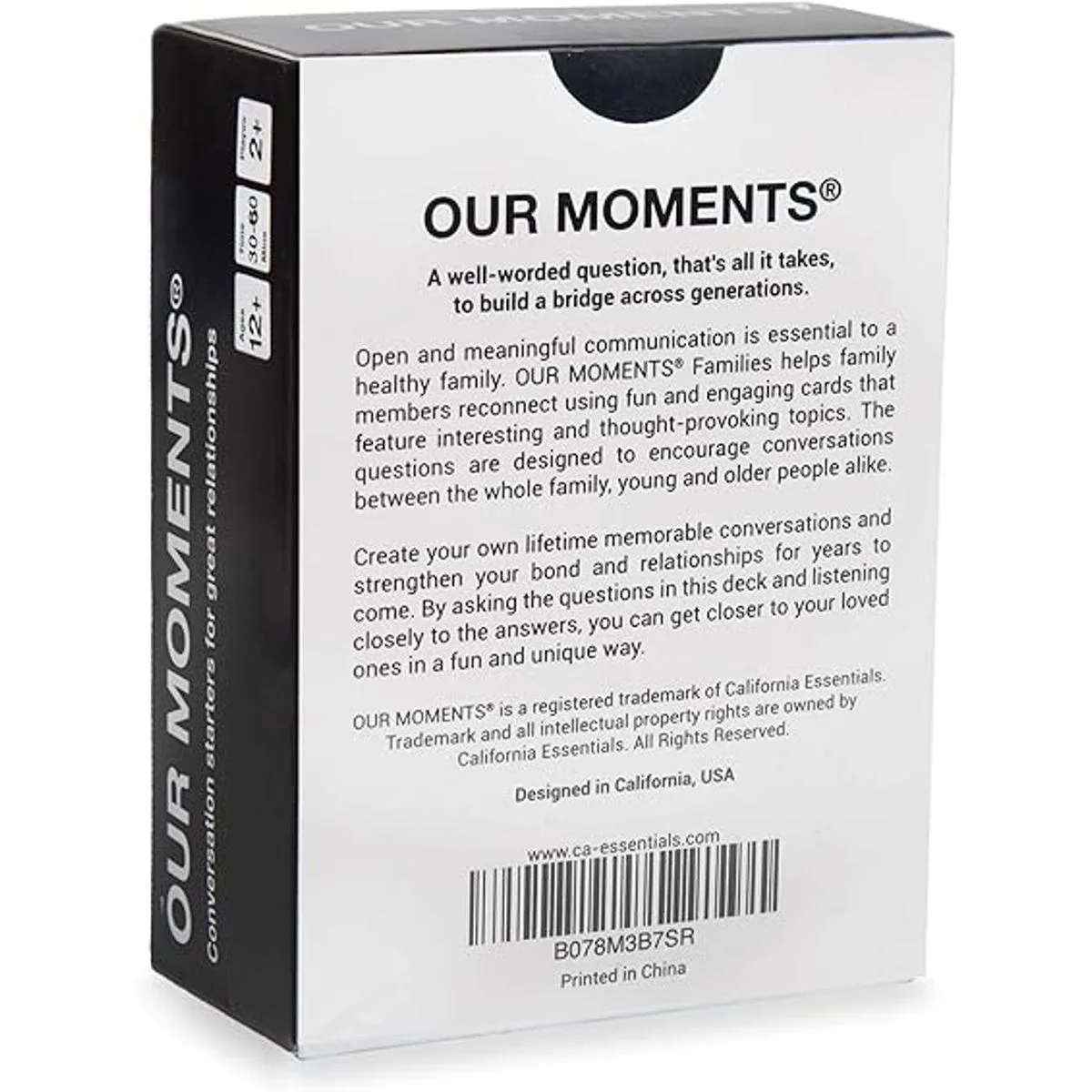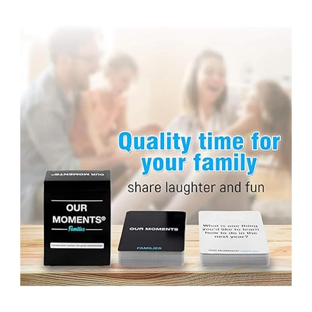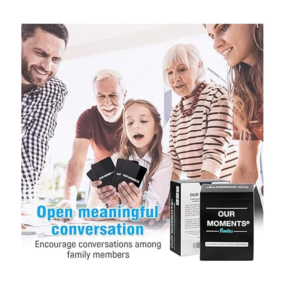 Comunicación abierta y significativa: la habilidad esencial para una familia saludable. NUESTROS MOMENTOS Las familias animan a los miembros de la familia a reconectarse en esta era de comunicación acrobacias con tarjetas divertidas y atractivas que cuentan con temas interesantes y provocadores de pensamiento. Fomenta las conversaciones entre los miembros de la familia.