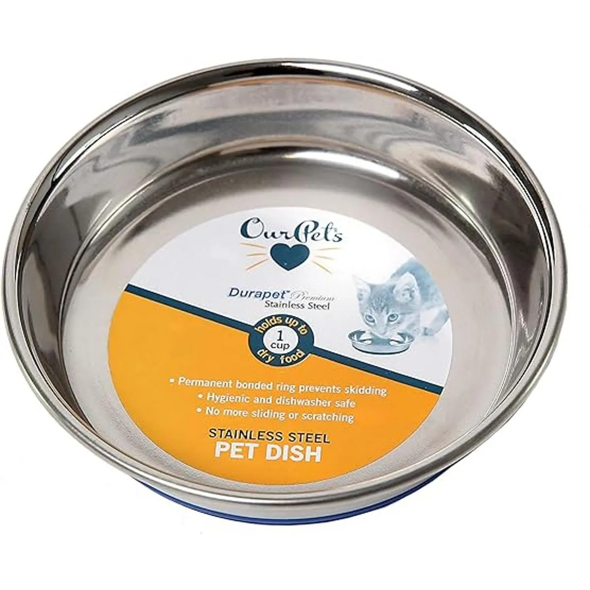 Our Pets DuraPet Cuencos antideslizantes de acero inoxidable para comida para gatos (cuenco para comida para gatos o para gatos) [Capacidad para hasta 1 – 1.75 tazas de comida seca para gatos o comida húmeda] Cuencos de alimentación para platos de gatos fáciles de limpiar
