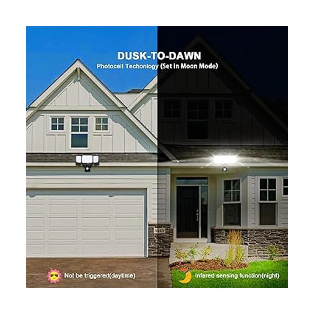 Motion Sensor Dusk to Dawn Adjustable This motion security light can be triggered by the moving human, cars or animals up to 26feet, sensing range at 180 detection angle. Longer lighting time: 12s to 7mins; Brings extra safety to your home. Dusk to Dawn adjustable, this security light can be set to work in the daytime.