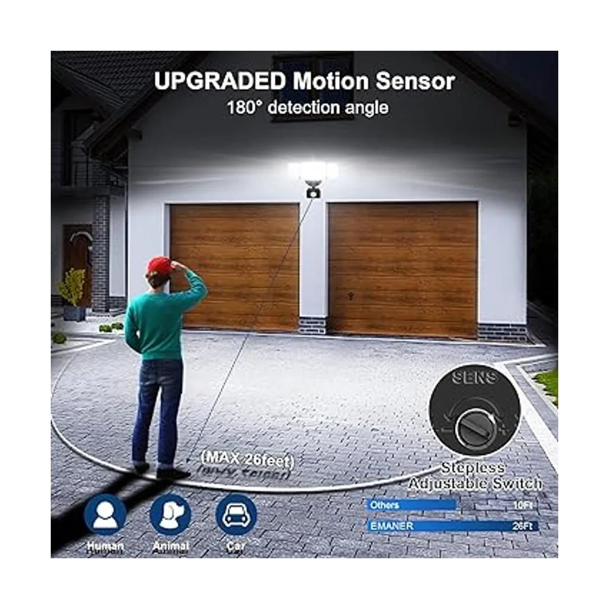 Outdoor Flood Lights Motion Sensor, Dusk to Dawn Detection Adjust, Outside LED Security Lights 4500lm 120V, 5000K 3Head Frosted Lens, LED Wall Lights for PatioDrivewayYard, EMANER 2Pack, Black