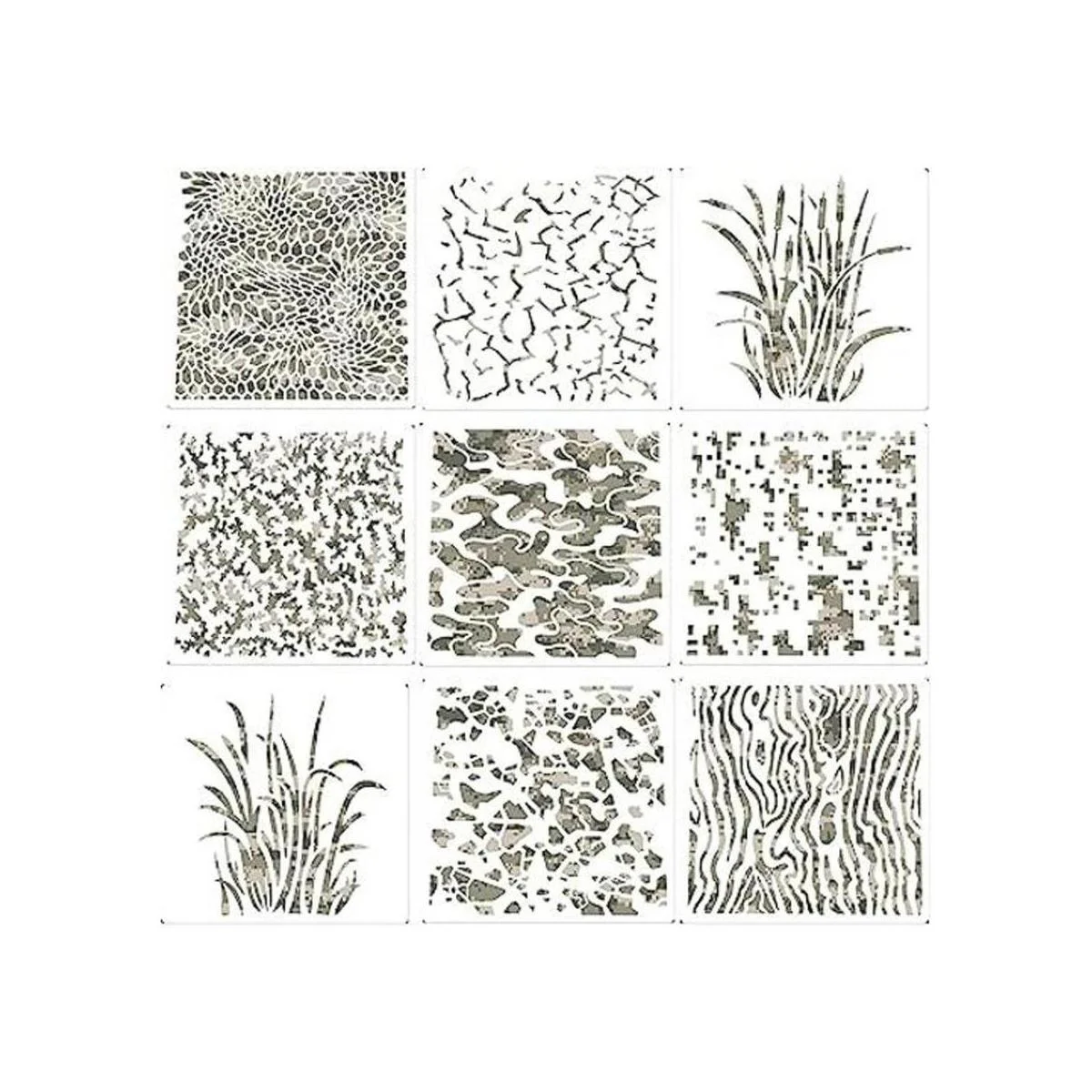Outus 9 plantillas de estampado de camuflaje, plantillas de pintura de camuflaje, plantillas reutilizables con patrón de hierba, plantillas de camuflaje verde, plantillas de bricolaje para álbumes de recortes, pintura en manualidades de madera 11.8 x 11.8 pulgadas