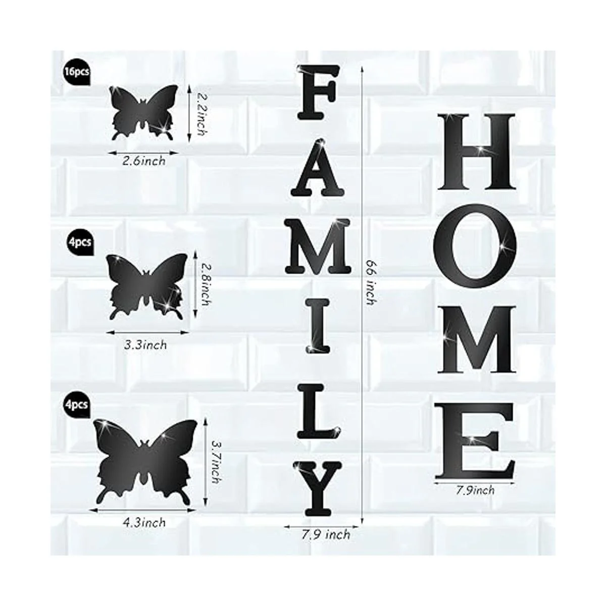 El paquete incluye: la combinación de calcomanías de pared de espejo 3D contiene 1 juego de calcomanías de pared de espejo de letras familiares con 6 calcomanías, 1 juego de calcomanías de pared de espejo de letrero de hogar con 4 calcomanías y 24 calcomanías de pared de mariposa de espejo de tamaño variable; el ancho de cada letra es de aproximadamente 7.9 pulgadas y las calcomanías de pared de mariposa de espejo son respectivamente 2.6 x 2.2.2.2 pulgadas de 16 pulgadas de 16 pulgadas de 16 pulgadas de 16 pulgadas de 16 pulgadas pequeñas, 3. 3 x 2. 8 pulgadas de 4 medianos y 4.3 x 3.7 pulgadas de 4 grandes