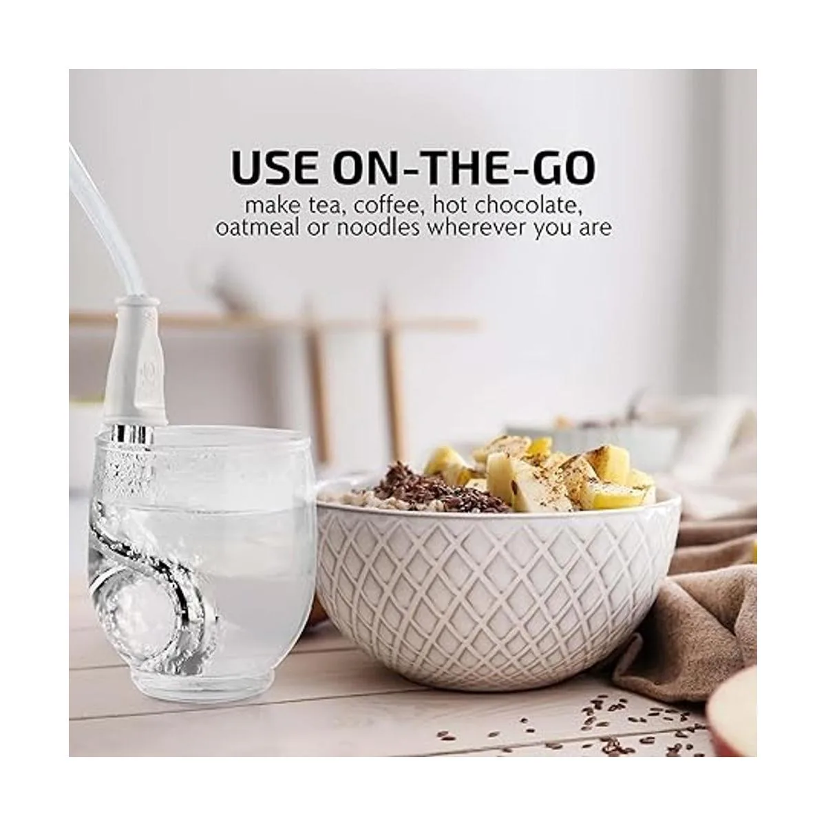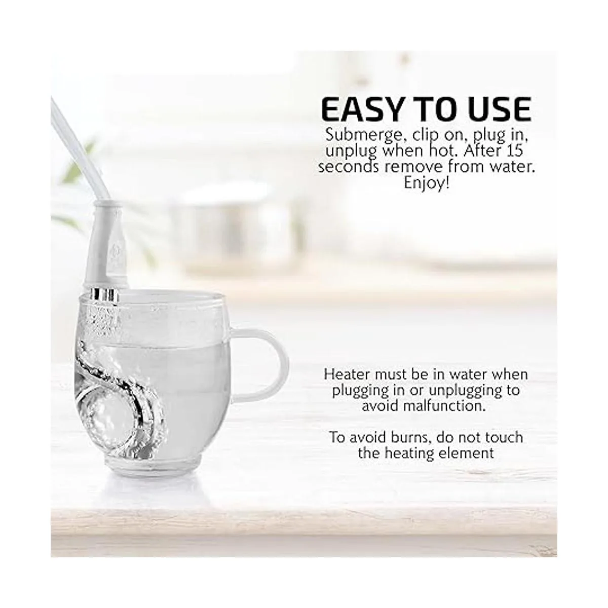 Fácil de usar: simplemente engancha en tu taza para sumergirla, conéctala, desenchufa cuando alcance la temperatura deseada, espera 15 segundos y luego retira del líquido.