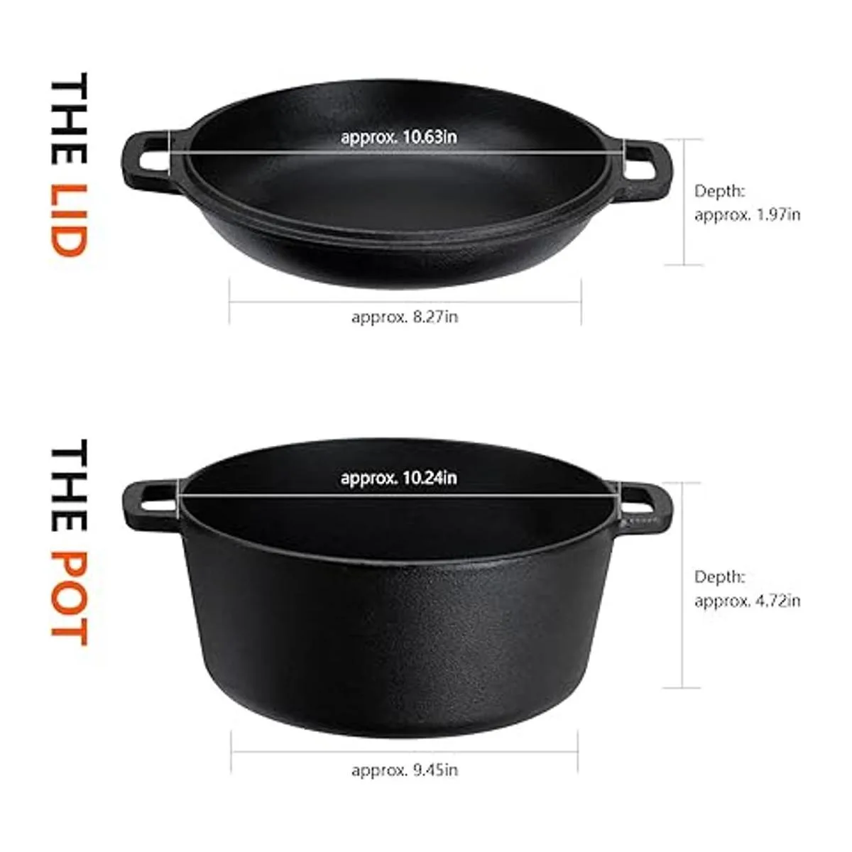 Horno holandés doble de hierro fundido de 5 cuartos de galón. El horno holandés doble Overmont de hierro fundido funciona horas extra. Con una tapa que se convierte fácilmente en una sartén. La cubierta abombada es ideal para asados y también para recetas de pan sin amasar. Conduce el calor de manera uniforme y eficiente, como solo puede hacerlo el hierro fundido. Medidas: 11x11x6.7 pulgadas con tapa.