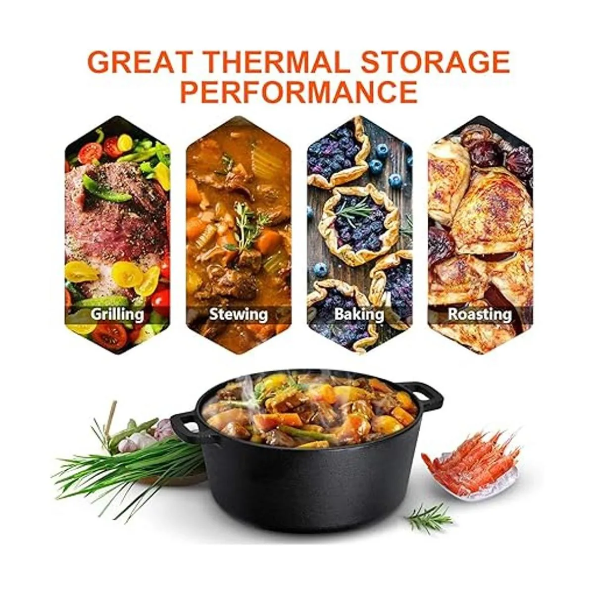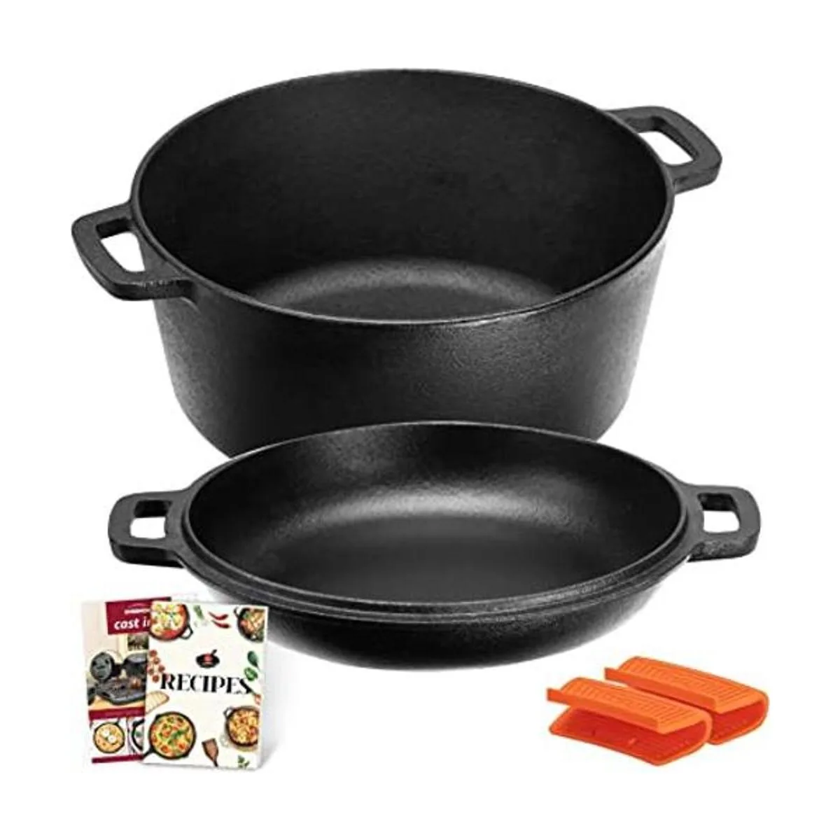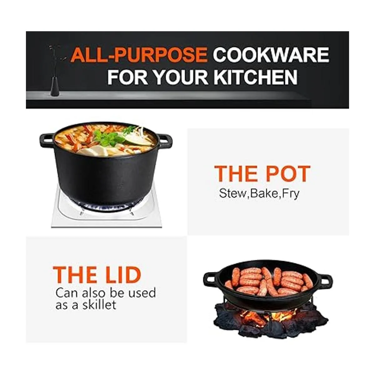 Overmont Olla de hierro fundido tipo horno holandés de 5 cuartos de galón tapa de sartén de 1.6 cuartos de galón, precurada con fundas para las asas y soporte para campamento, hogar, cocina, barbacoa, hornear