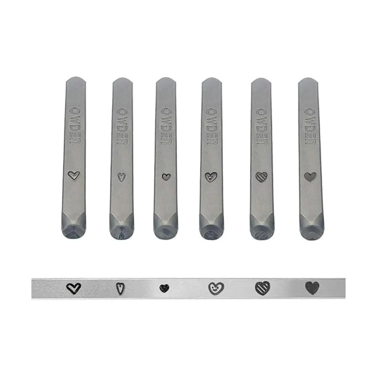 OWDEN Juego de sellos de metal para joyería, 6 sellos de diseño de corazón amor, 6 estilos de acero con sello de corazón, sellos de metal para trabajo de joyas, sellos de metal en blanco