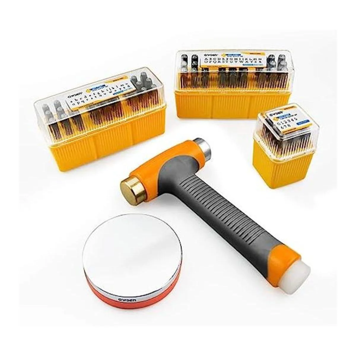 OWDEN Kit de sellos de metal para joyería para hacer estampación de joyas, tamaño 18 pulgadas, 0.118 in, 2 juegos de punzón de letras mayúscula y minúscula con 1 juego de punzón de números, 1 martillo y 1 bloque de banco de acero