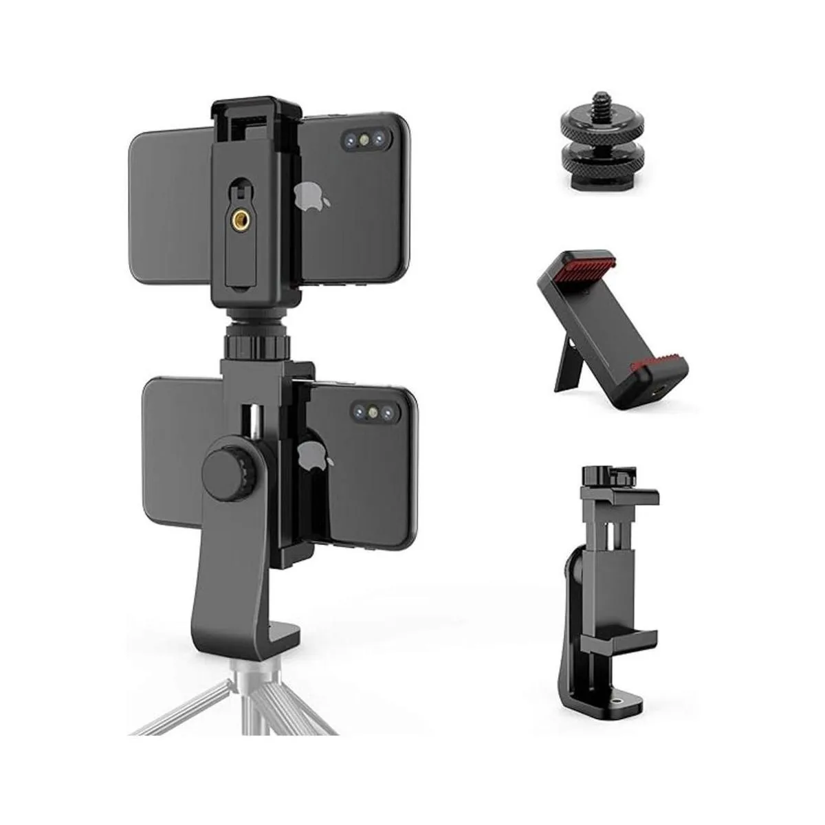 Bono premium Compra un soporte de adaptador de trípode de teléfono dual de rotación de 360 de alta calidad para obtener una abrazadera extra de soporte de teléfono premium. La abrazadera de soporte para teléfono inteligente se puede utilizar como un escritorio o conexión a los trípodes, monópodos y palos de selfie