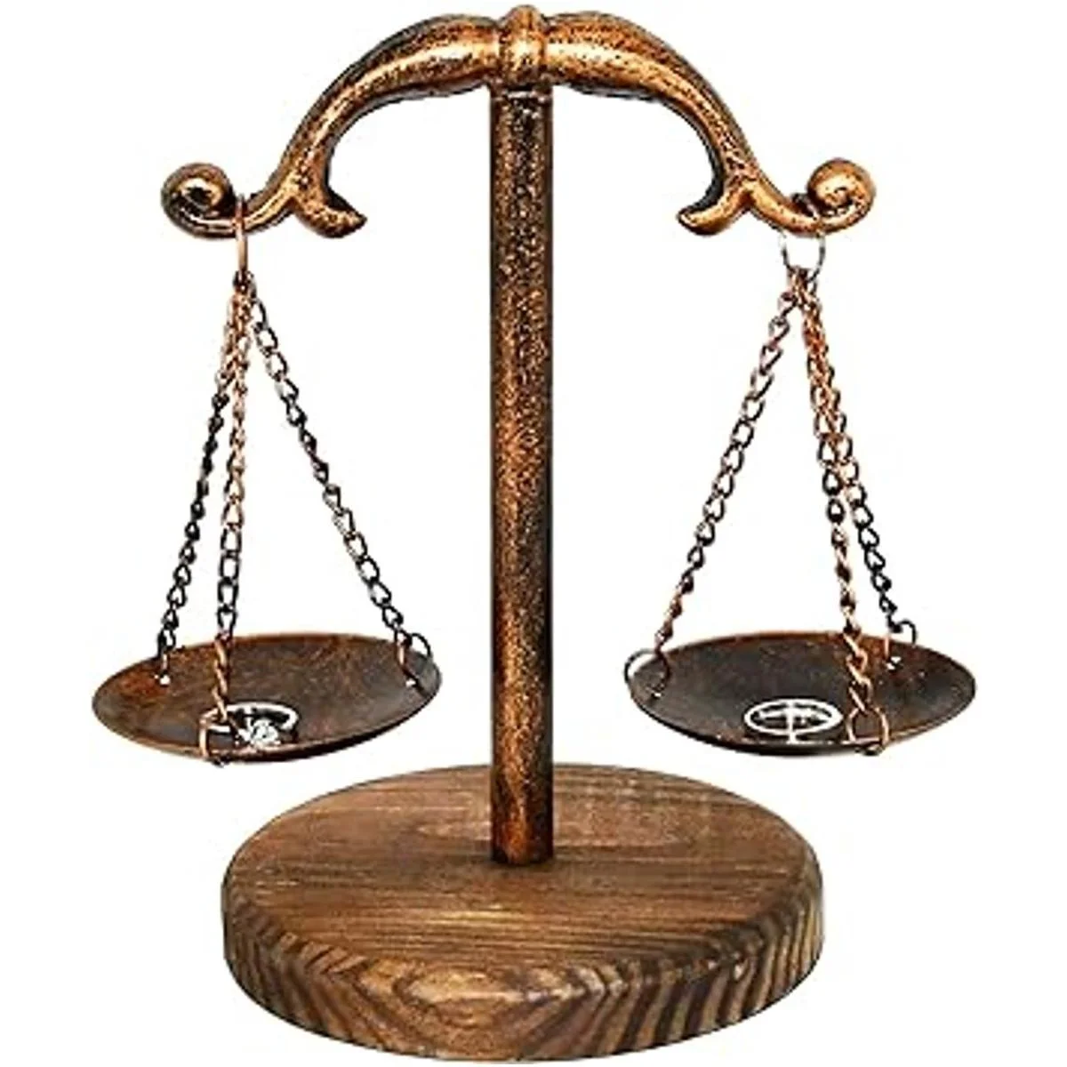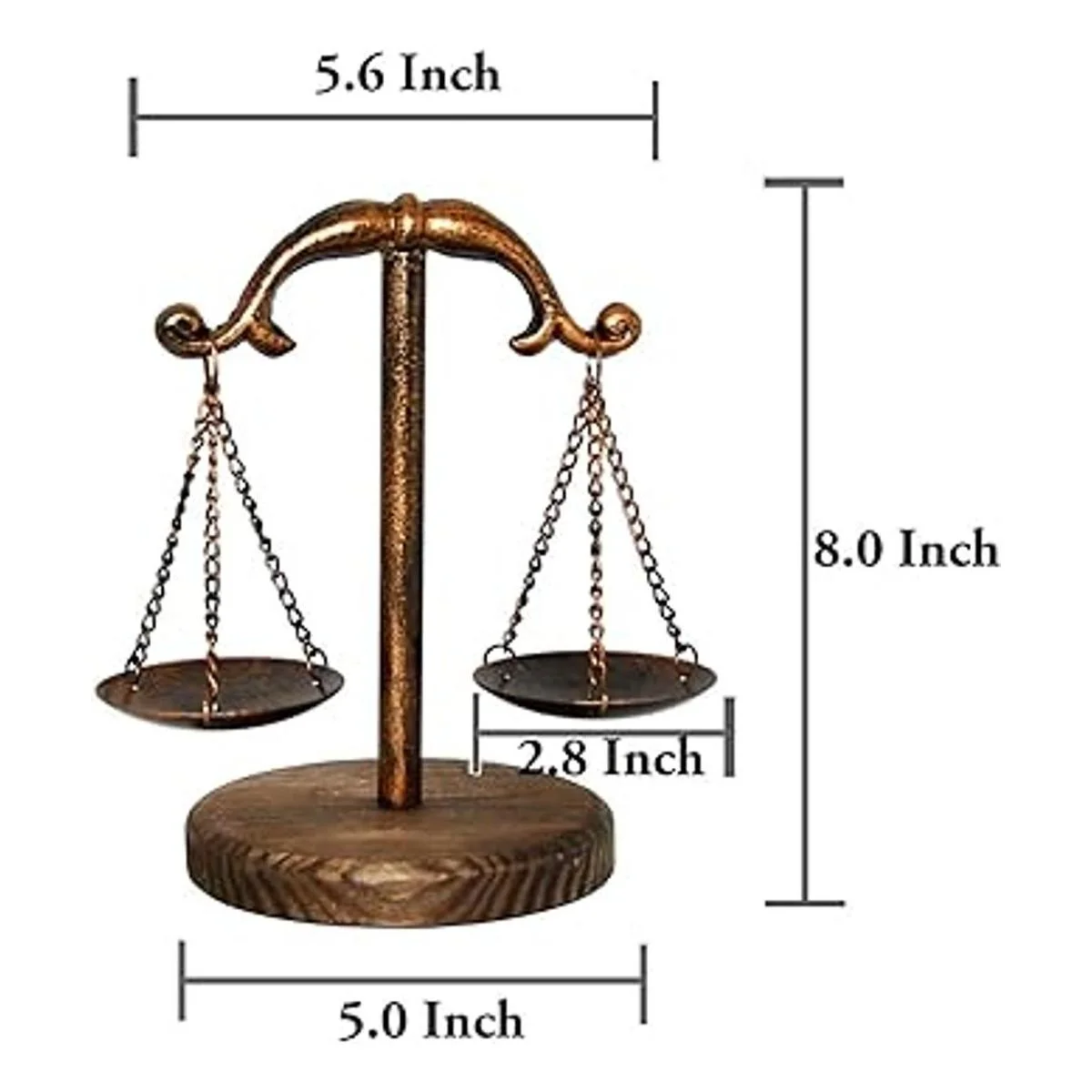 OwlGift Bandeja de metal Libra de estilo vintage con base de madera, organizador de cosméticos, escala de abogado, portavelas de granja, decoración del hogar, báscula de equilibrio de peso antigua, bronce