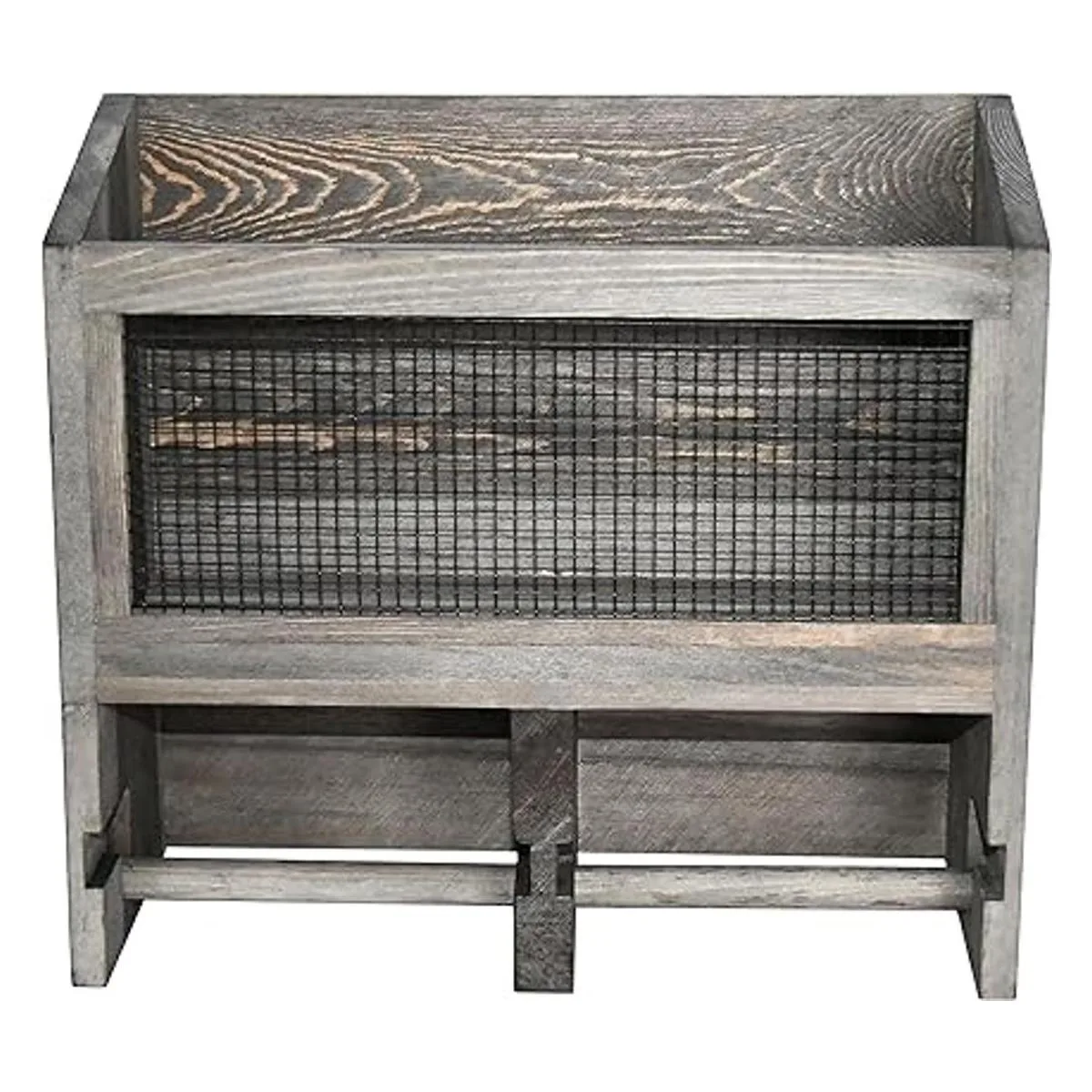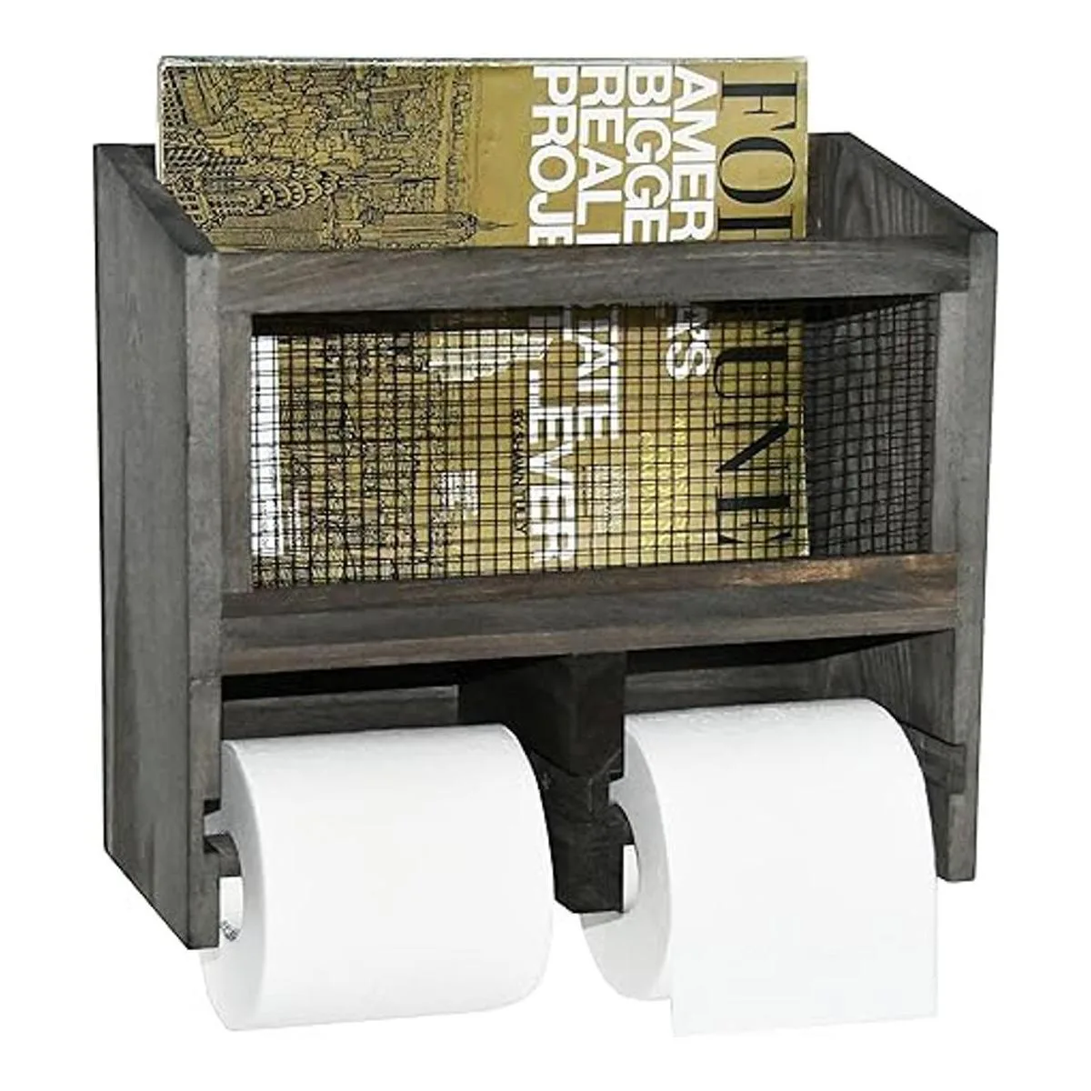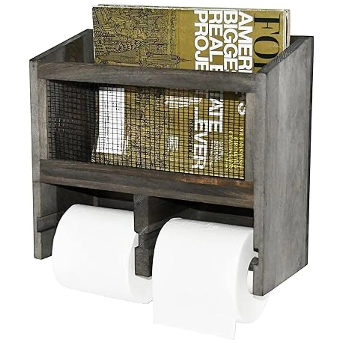 Dispensador de rollo de papel higiénico doble de madera maciza gris vintage y malla metálica montado en la pared y cesta de soporte para revistas, perfecto para añadir un almacenamiento conveniente a cualquier entorno de baño en casa.