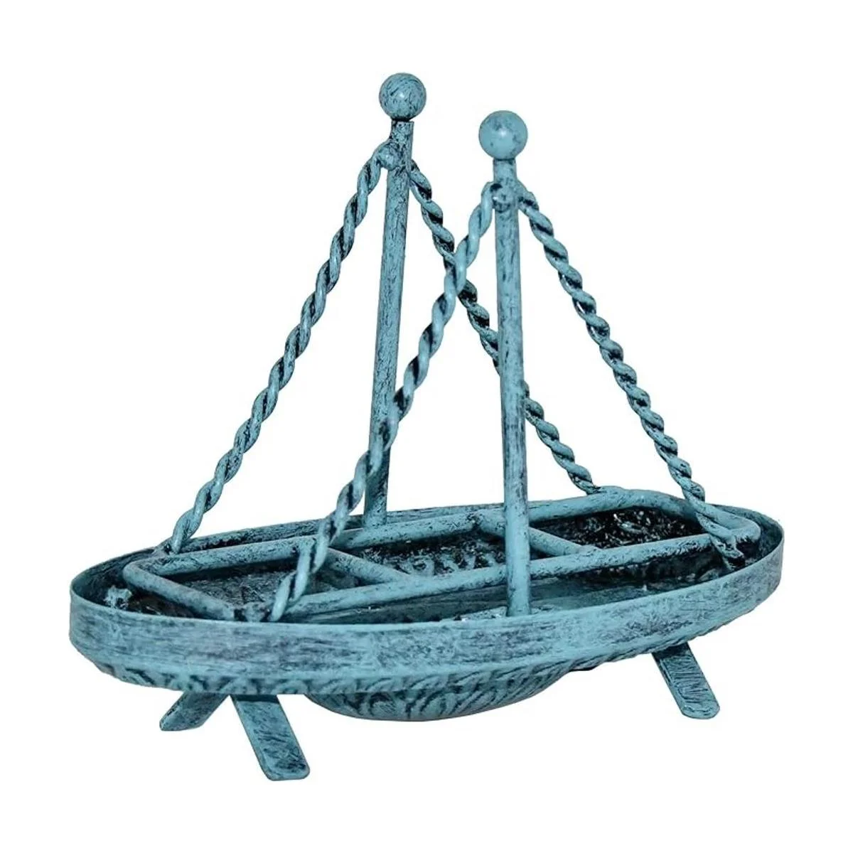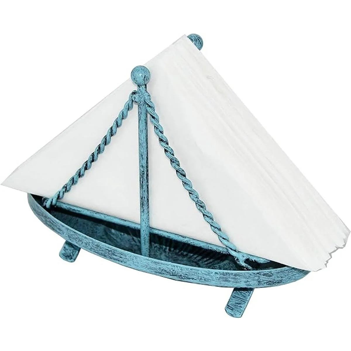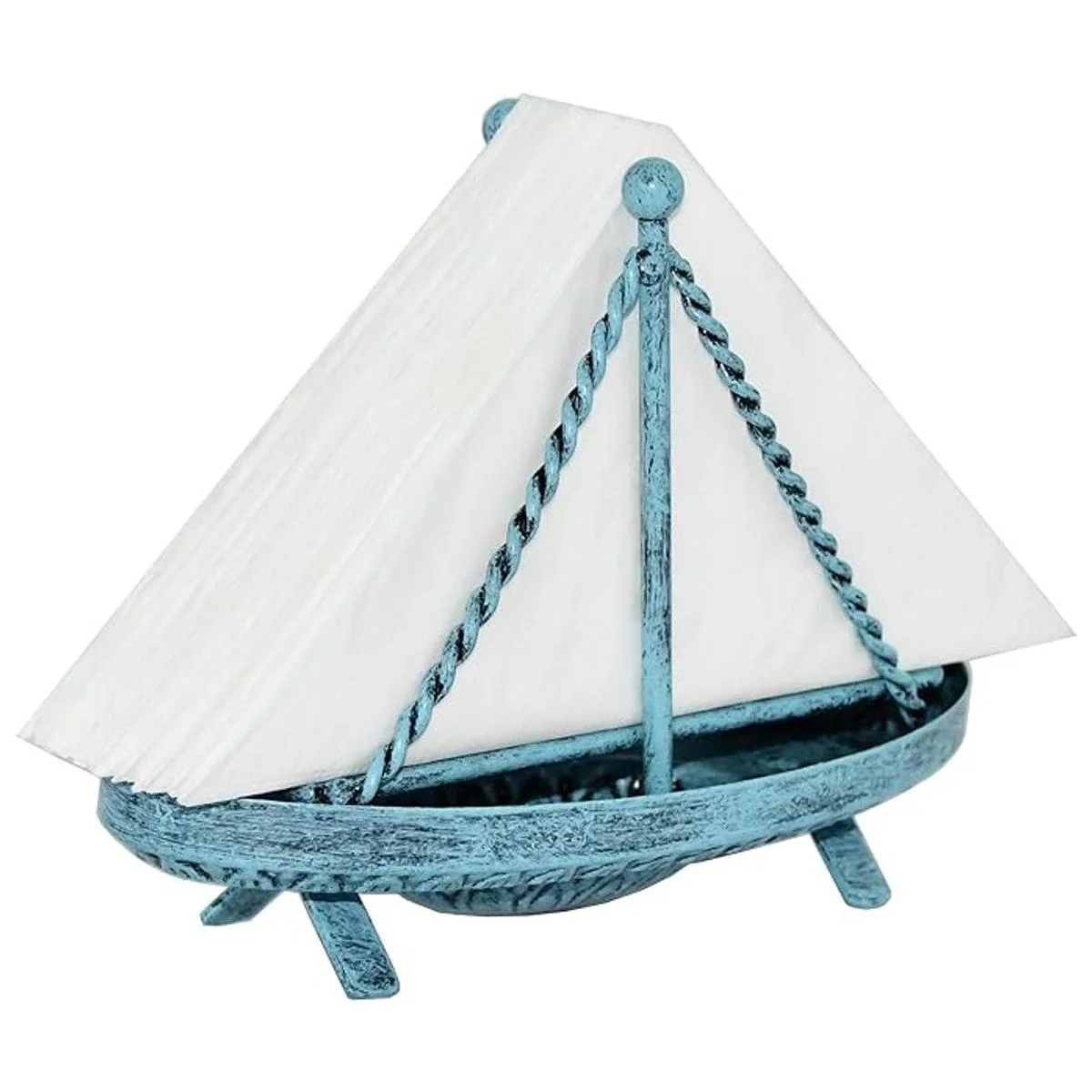 Servilletero de metal con diseño de barco de vela con acabado rústico turquesa.
