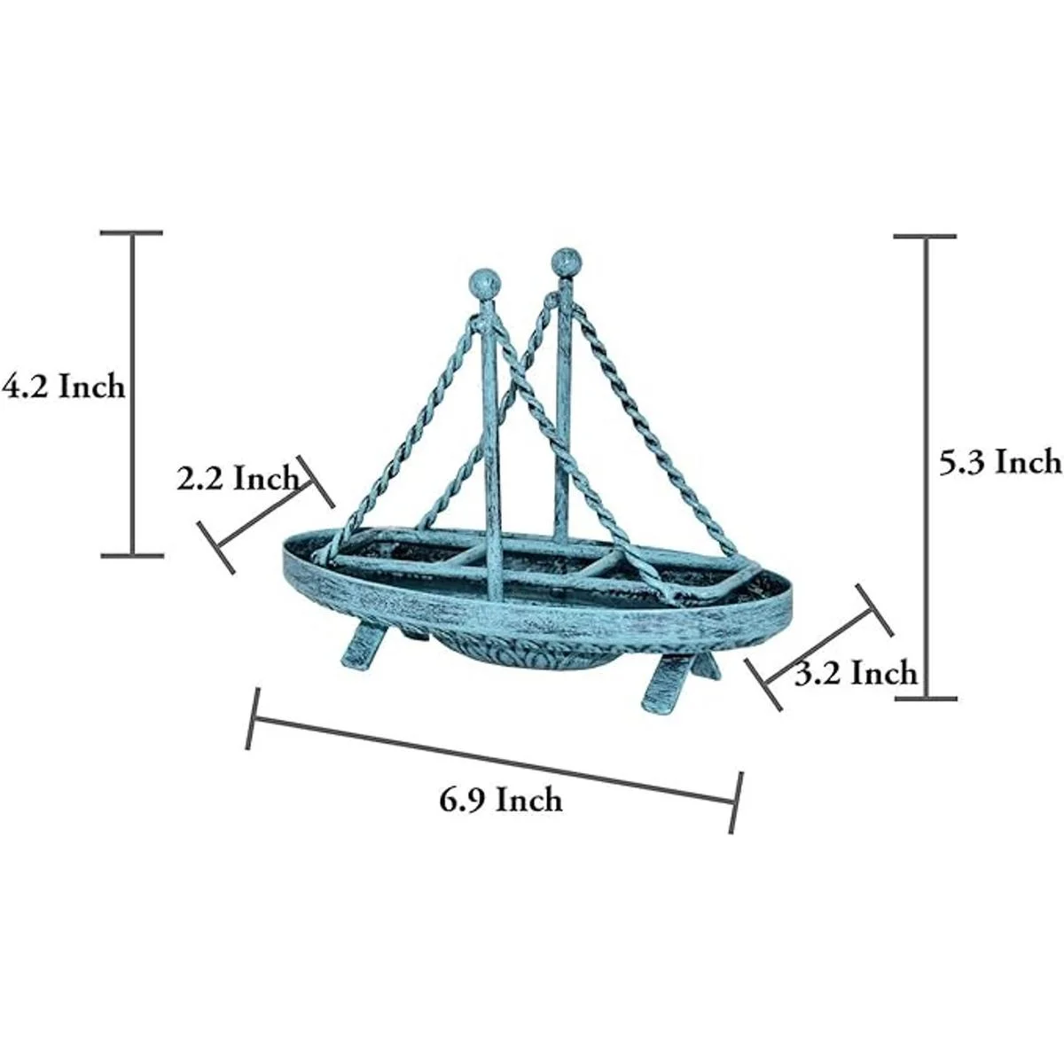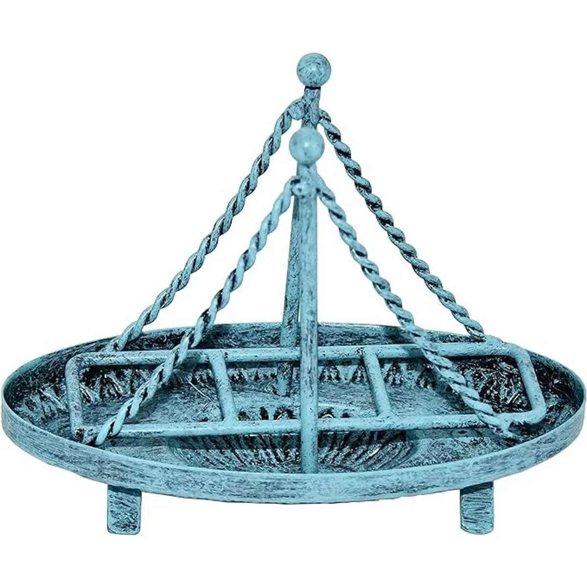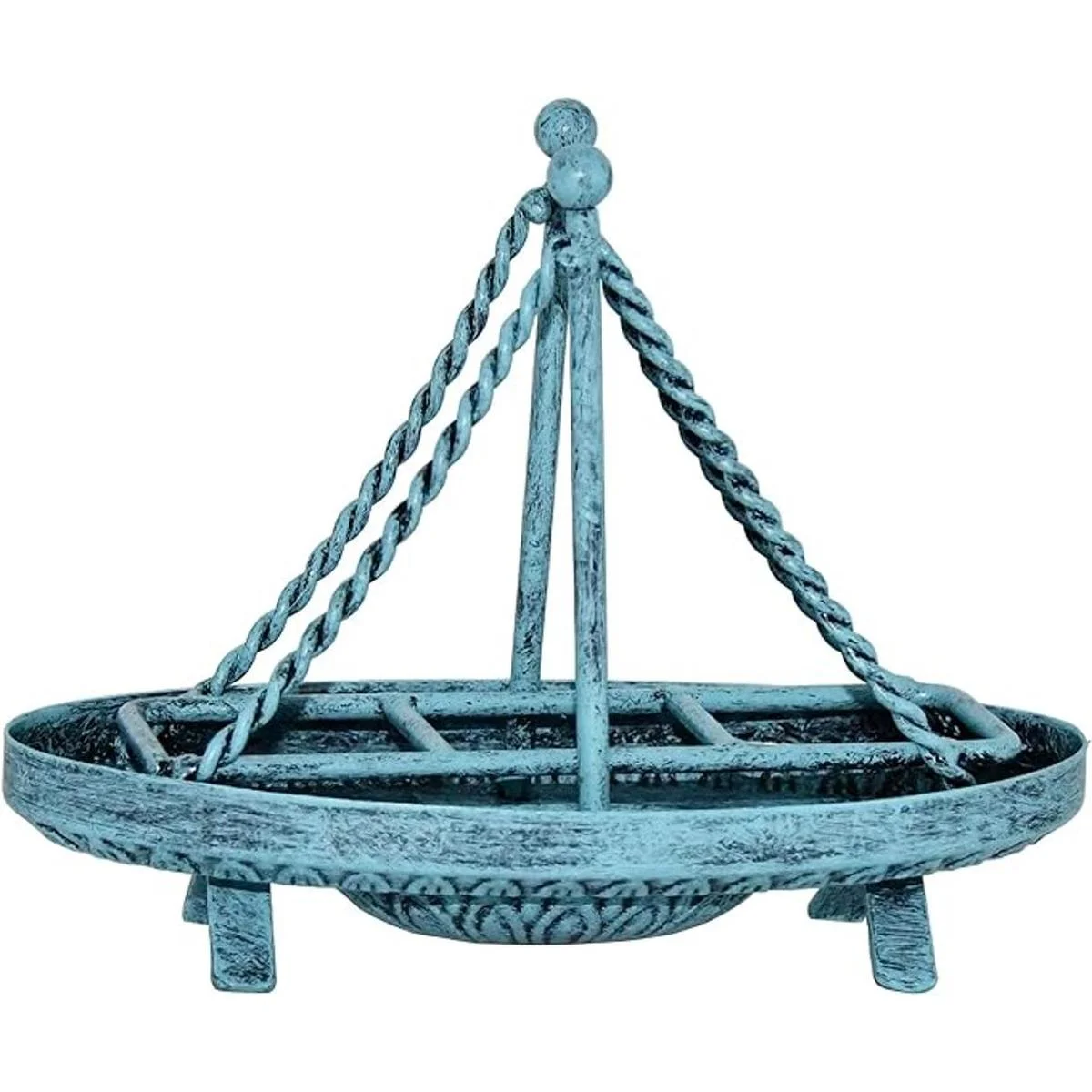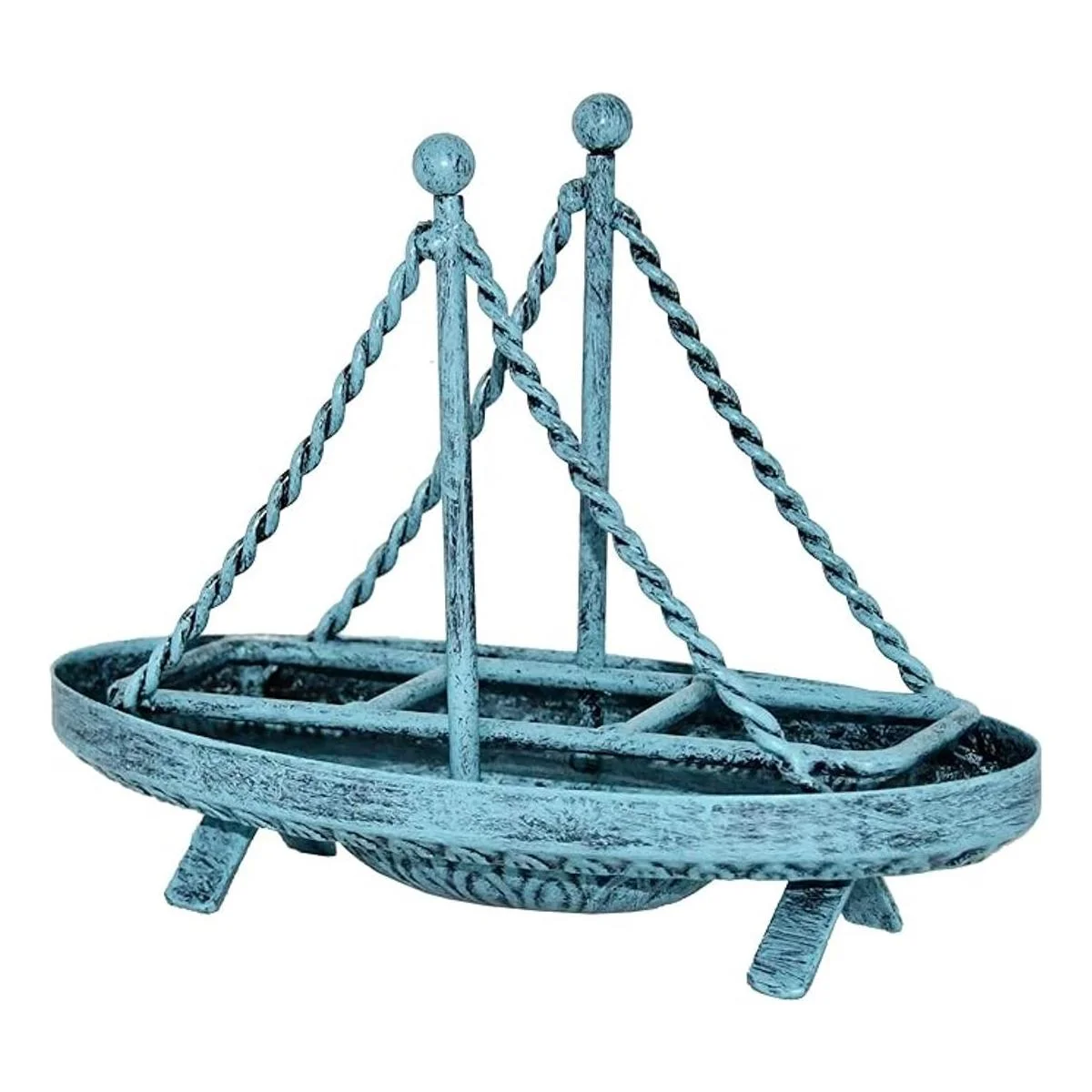 Servilletero de metal con diseño de barco de vela con acabado rústico turquesa.