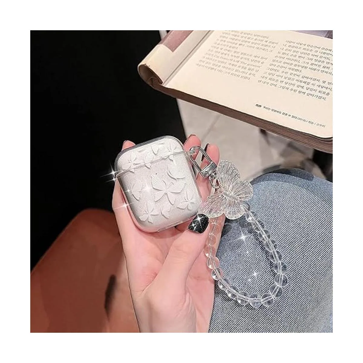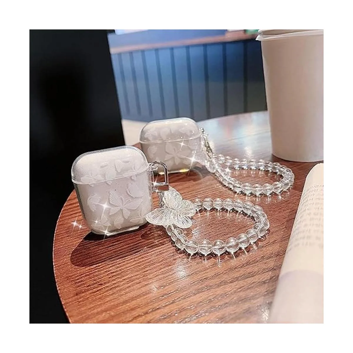 Ownest Compatible con la funda AirPods, lindo patrón de mariposa transparente suave TPU a prueba de golpes, con purpurina y llavero para mujeres y niñas, para AirPods 2 y 1 blanco
