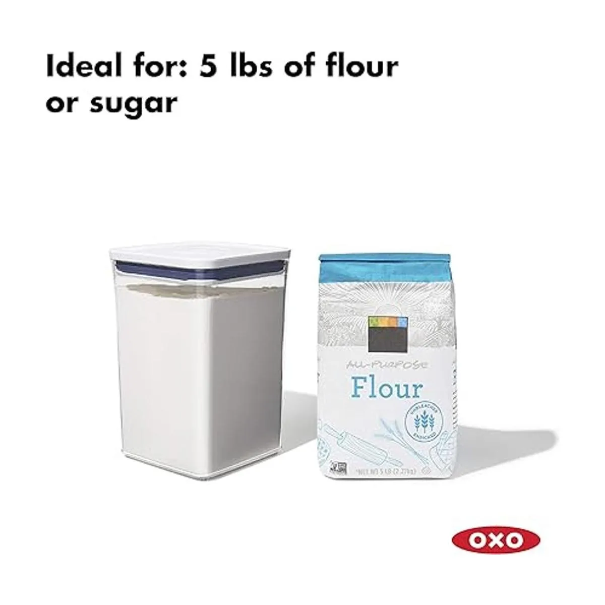 Set includes: Three 4.4 Qt Containers ideal for storing 5 lb bags of flour, sugar and other economysized staples, and three handy cup scoops that neatly attach to the underside of POP Container lids