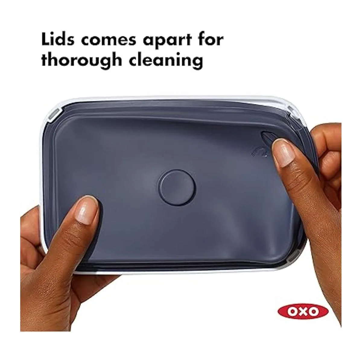 Push the button to engage the airtight seal. The button doubles as a handle for the lid