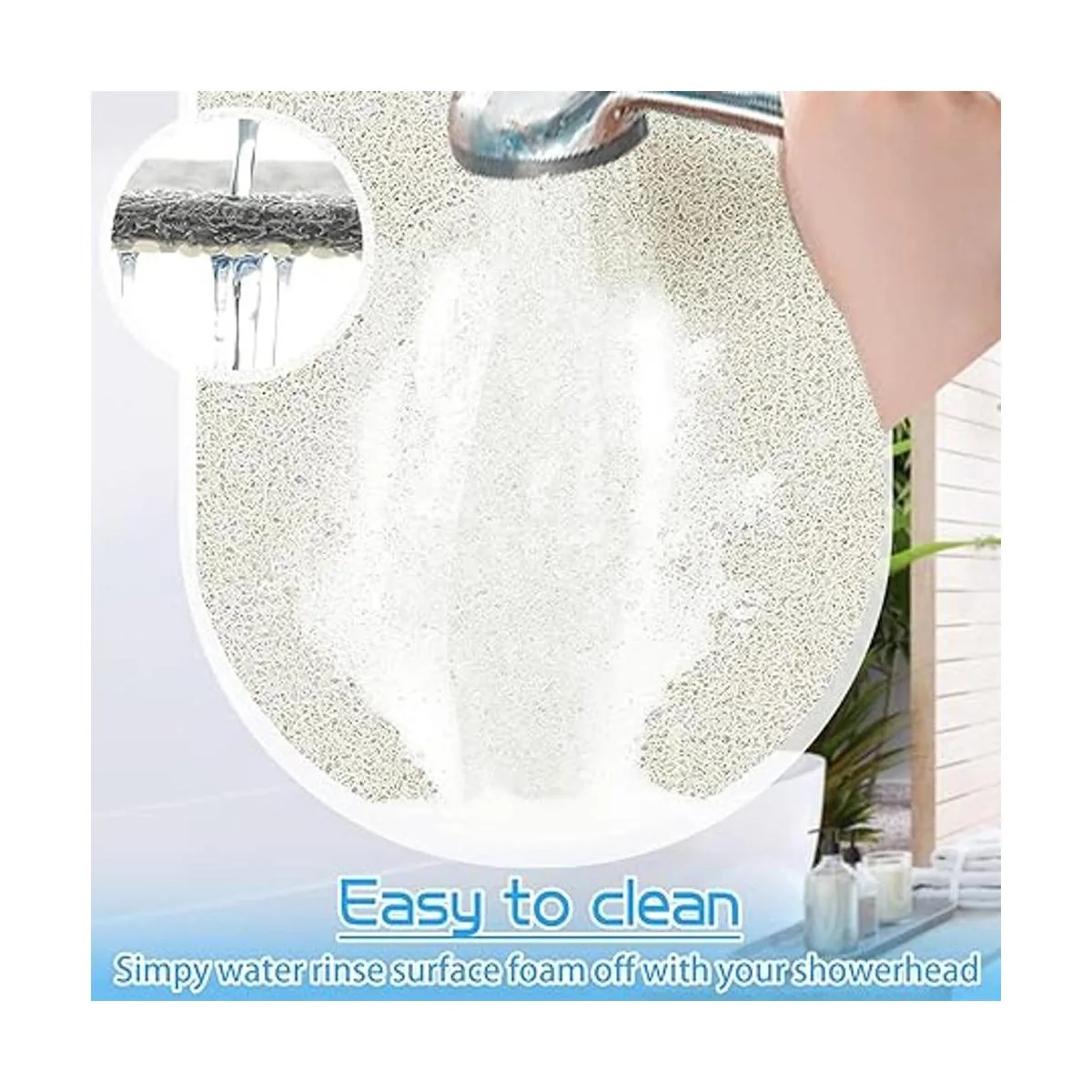 Fácil de limpiar y de secado rápido: simplemente puedes utilizar un cabezal de ducha para enjuagar la espuma o los pelos de la parte superior de la alfombrilla. Nuestra alfombrilla de ducha reciclable se puede lavar en agua tibia. La construcción porosa de la superficie de lufa permite que el agua fluya a través de ella y se drene para hacer que la alfombrilla se seque rápidamente. Esta alfombrilla de baño para bañera es resistente a la suciedad de jabón y no raya ni deja residuos en bañeras reesmaltadas.